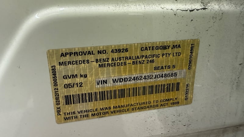 2012 Mercedes-Benz B200 W246 B200 Year: 2012 Make: Mercedes-Benz Model: B200 Series: W246 Badge: B200 Body: 5-Door Hatch Drive Type: Front wheel drive Odometer: Indicating 216,976 Kilometers Engine: 1.6 I4 Turbo Petrol Colour: Silver Seats: 5 Description/extras: Air Conditioning, Power windows. Engine light on. Price Guide - $5,900 - $8,000 (Based on Unmodified Vehicle) VIN: WDD2462432J048685 ENG No: 27091030023941 (Key #B48 Carrara) Lloyds stock #587545+1 #PCV #ONETOTEN