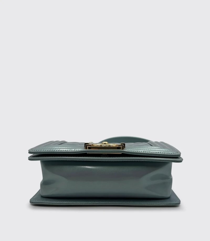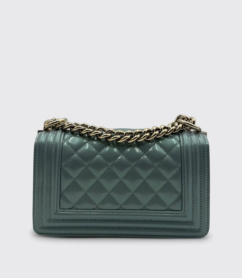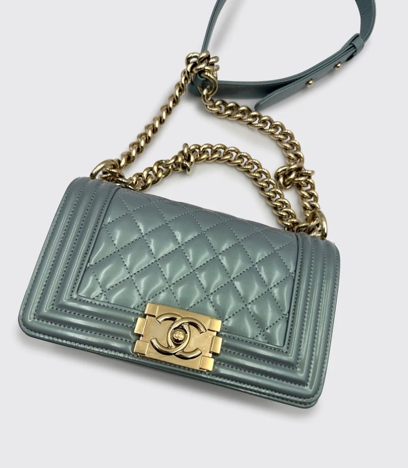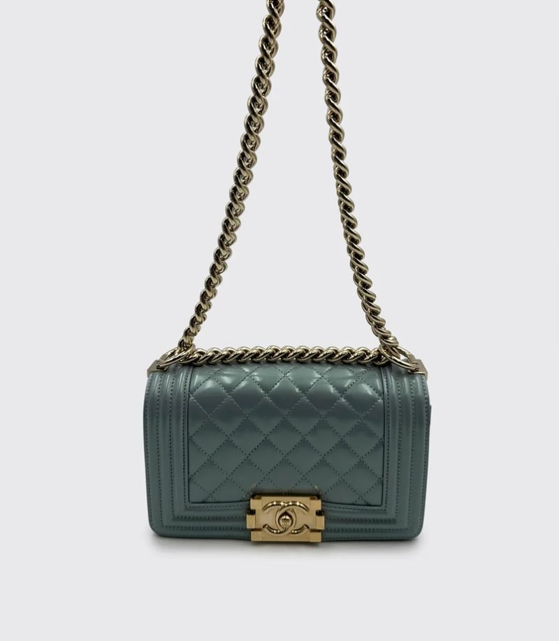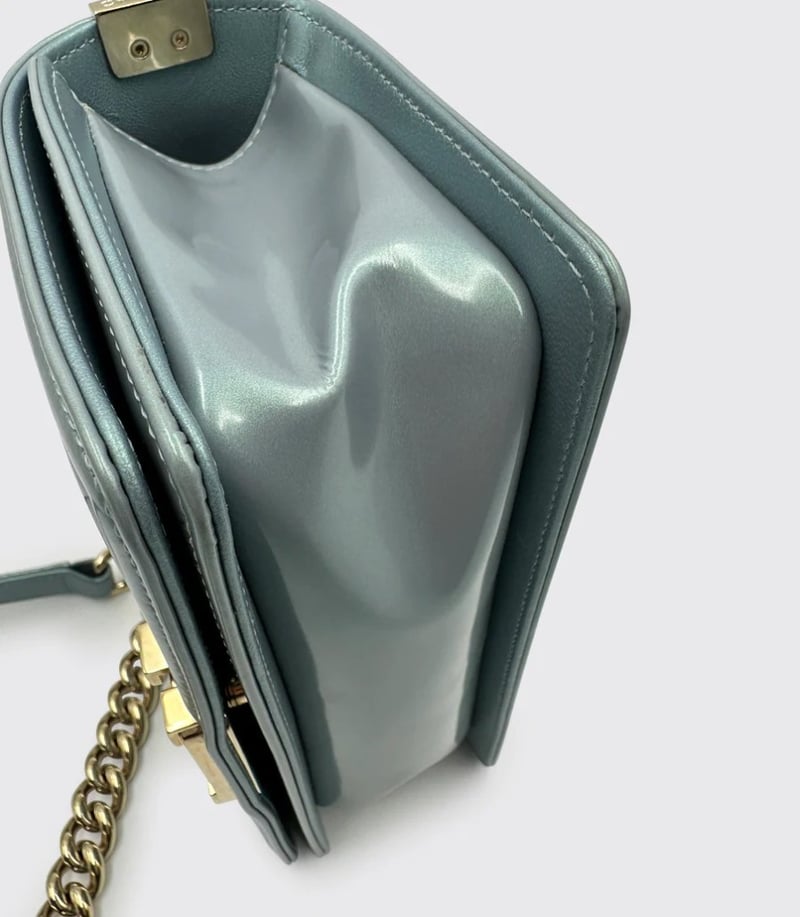 CHANEL BOY BAG PATENT LEATHER BABY BLUE SMALLItem Size: Height: 8cm, Width: 20.5cm, Depth: 13cmCondition: 9/10Exterior: Some Small Marks On The Flap. Interior: Some Light Marks Under Flap. Some Protective Stickers Still In Place. Hardware: Minor Hairline Scratches & Discolouration On The Buckle. Hairline Scratches On Gold Hardware.Condition: Good - Refer To ImagesCROSSDOCK162931+5