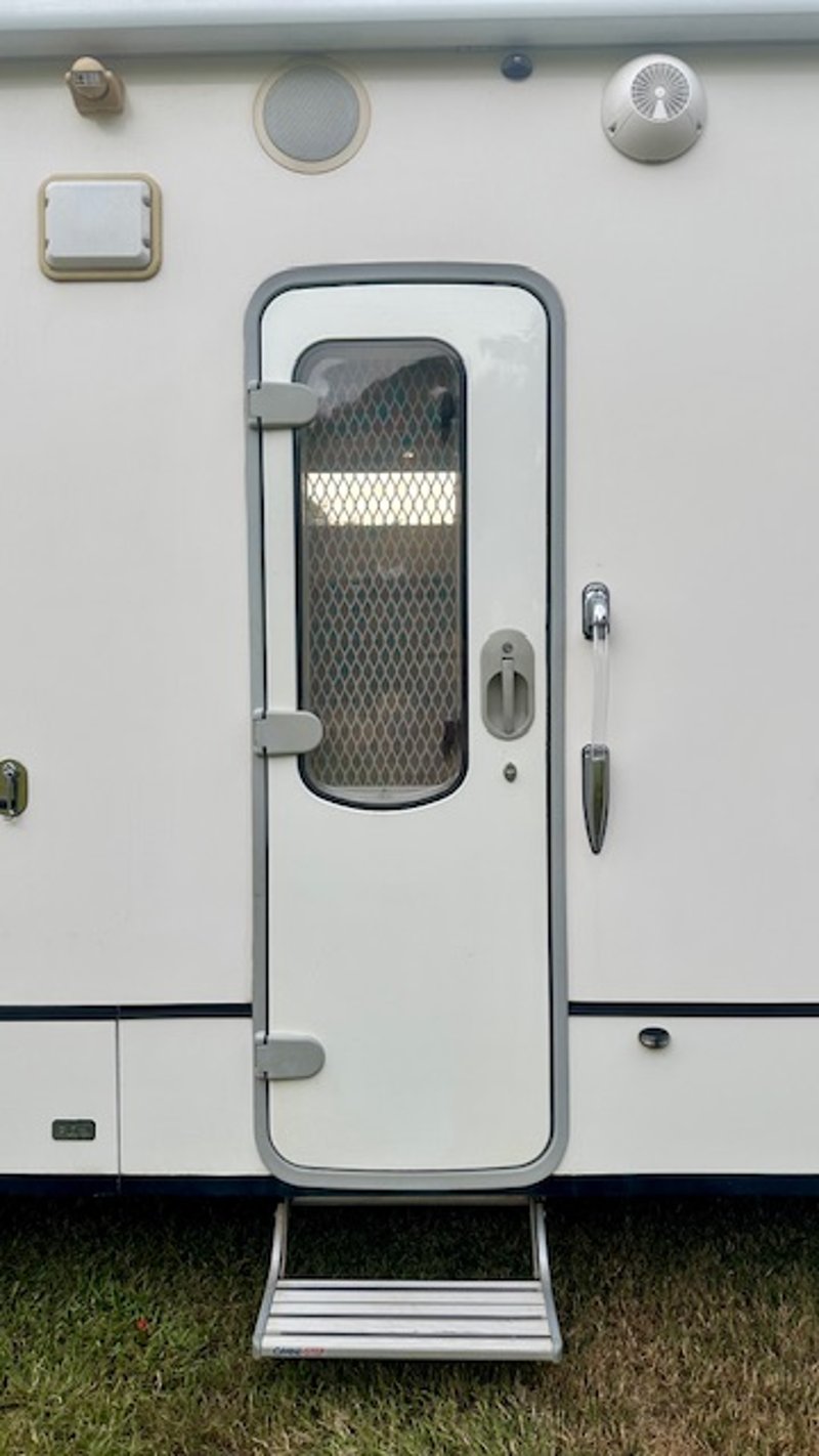Full size Omnistor awning on living side and 2 smaller awnings over windows on the opposite side.