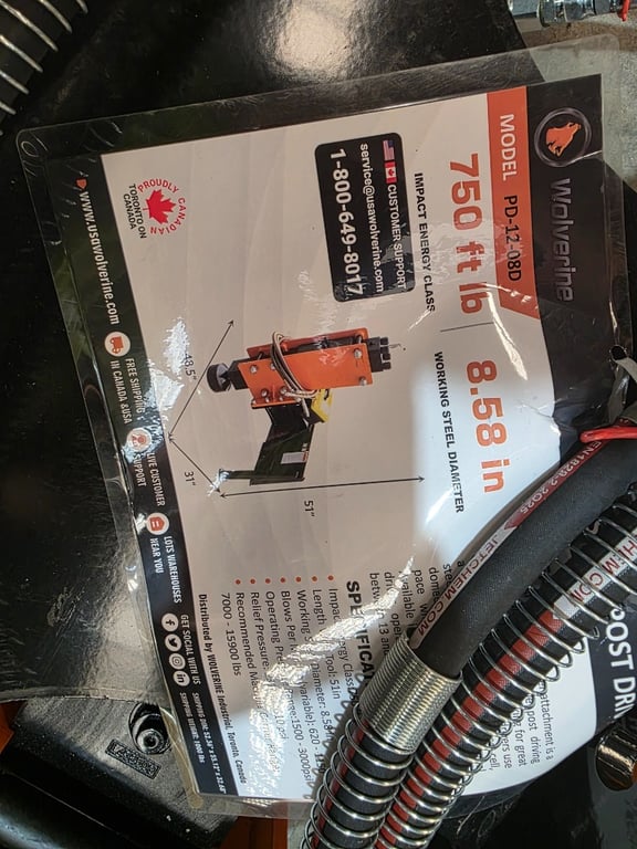 FACTORY DIRECT ** Unused 2025 WOLVERINE Skid Steer Post Driver, PD-12-08D Impact Energy Class:750 ft lb Operating Weight:926 lbs Length With Tool:51in Overall Width :49 in Working Steel Diameter:8.58 in Blows Per Minute (variable):620 - 1150 Oil Flow Range:11.9 - 21.9 gpm Operating Pressure Range:1500 - 3000psi Relief Pressure:2,310 - 2,610 psi Recommended Machine Carrier Range:7,000 - 15,900 lbs Inflation pressure: 160-200 PSI Measurement Approx: 1230*785*1295 Weight Approx: 430 kg Contact: King Cheung - 0477 987 576 or [email protected] Please note: minor scuffs and marks may be evident Note: OEM images and VIDEOS shown are for illustration purposes only, and used as a guide only, inspections highly recommended.