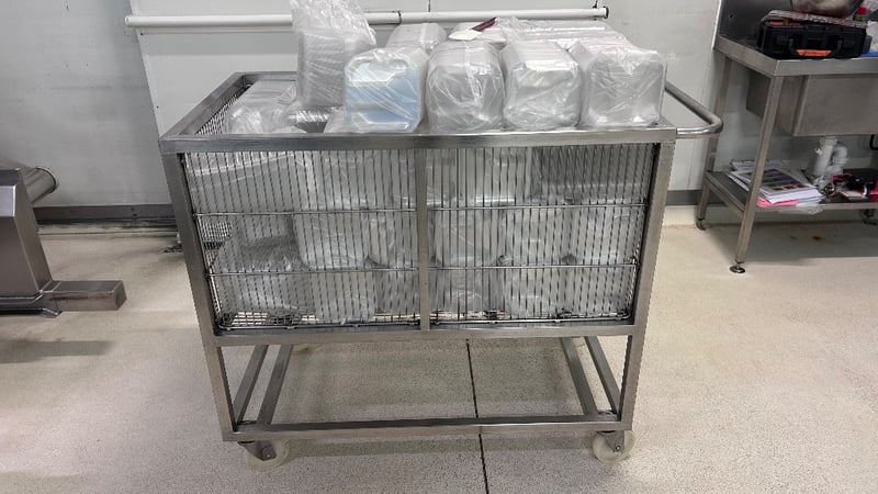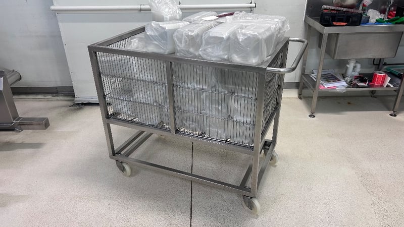 Trolley, Stainless Steel Storage Trolley On Wheels, Includes Various Food Storage Containers.Dimensions: H:100cm x W:124cm x D:65cm.Sold As Lot.