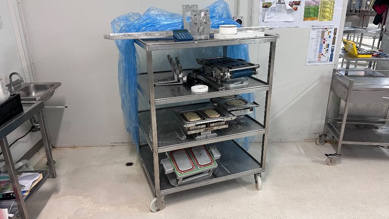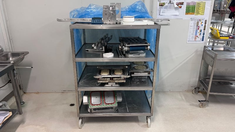 Trolley, Stainless Steel Trolley On Wheels, Including Various Machine Components.Dimensions: H:135cm x W:100cm x D:85cm.Sold As Lot.Note: Items In Background Not Included.