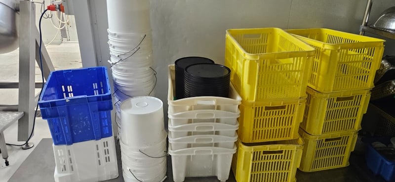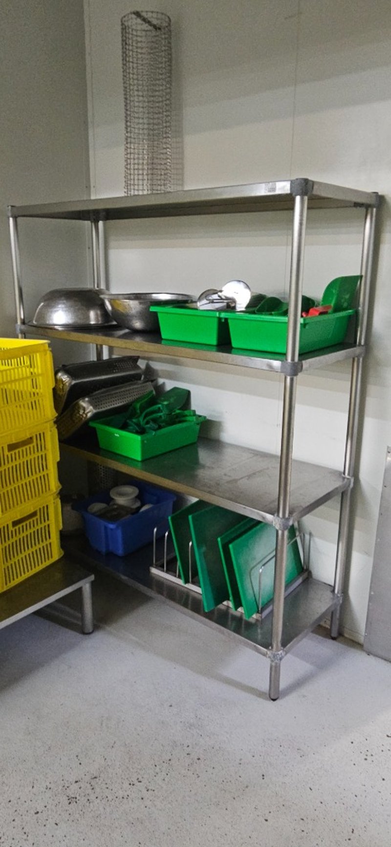 Equipment, Assorted Equipment including Crates, Utensils and more. Shelving Included.Sold as lot