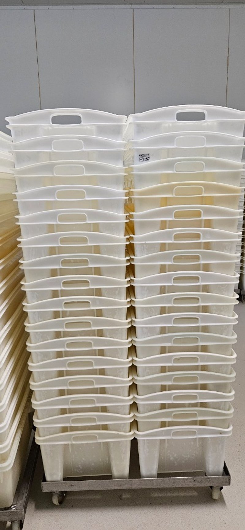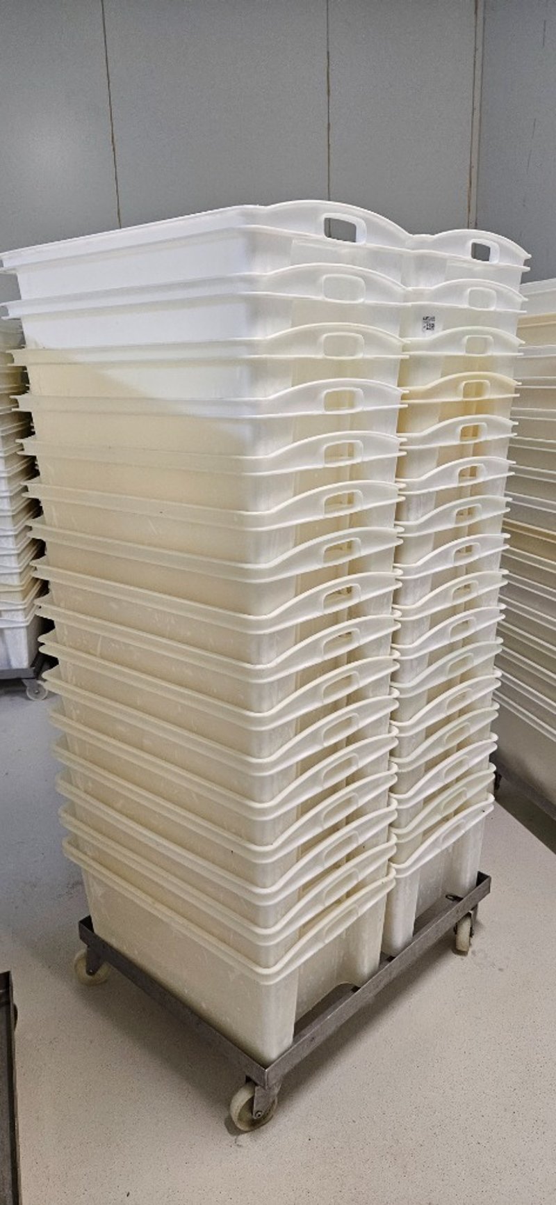 Tubs with Dollie, 32x Plastic Tubs with Stainless Steel Dollie, L 71cm W 44cm H 33cm