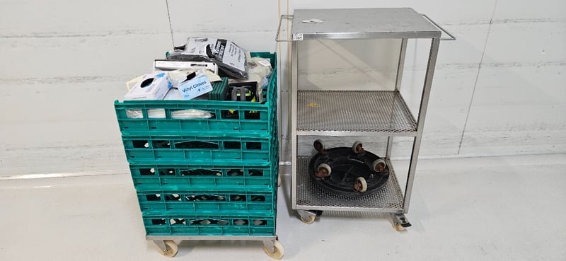 Equipment, Assorted items including 3 Tier Stainless Steel Trolley W 60cm D 50cm H 104cm, Bread Trays with Dollie and moreSold as Lot