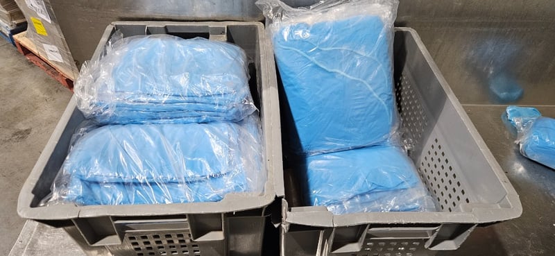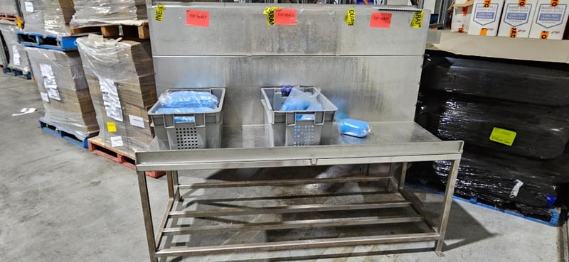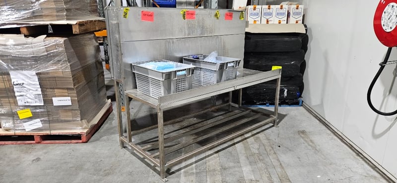 Workbench, Stainless Steel Workbench with Cupboard on Rear and 2x Crates of Hairnets, W 193cm D 91cm H 247cmSold as lot