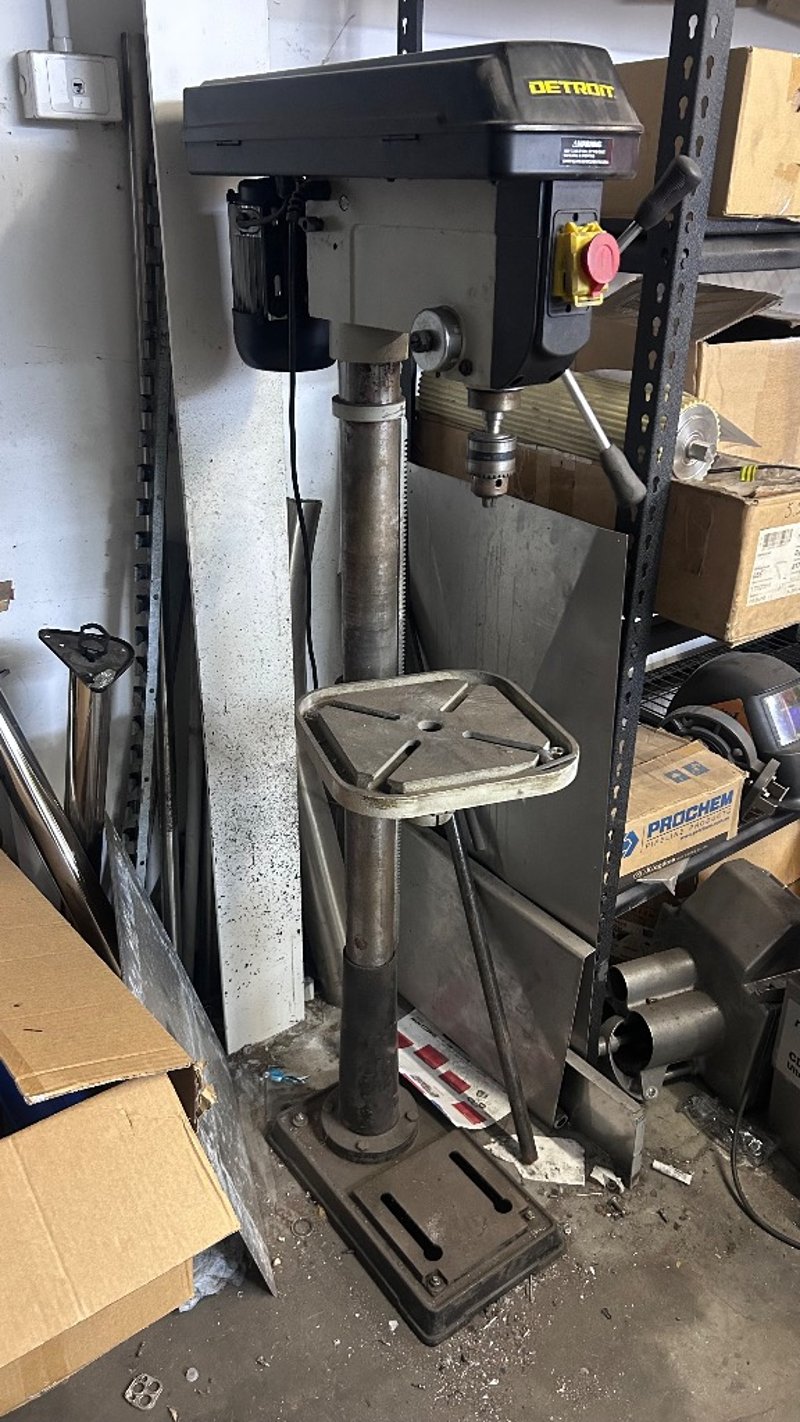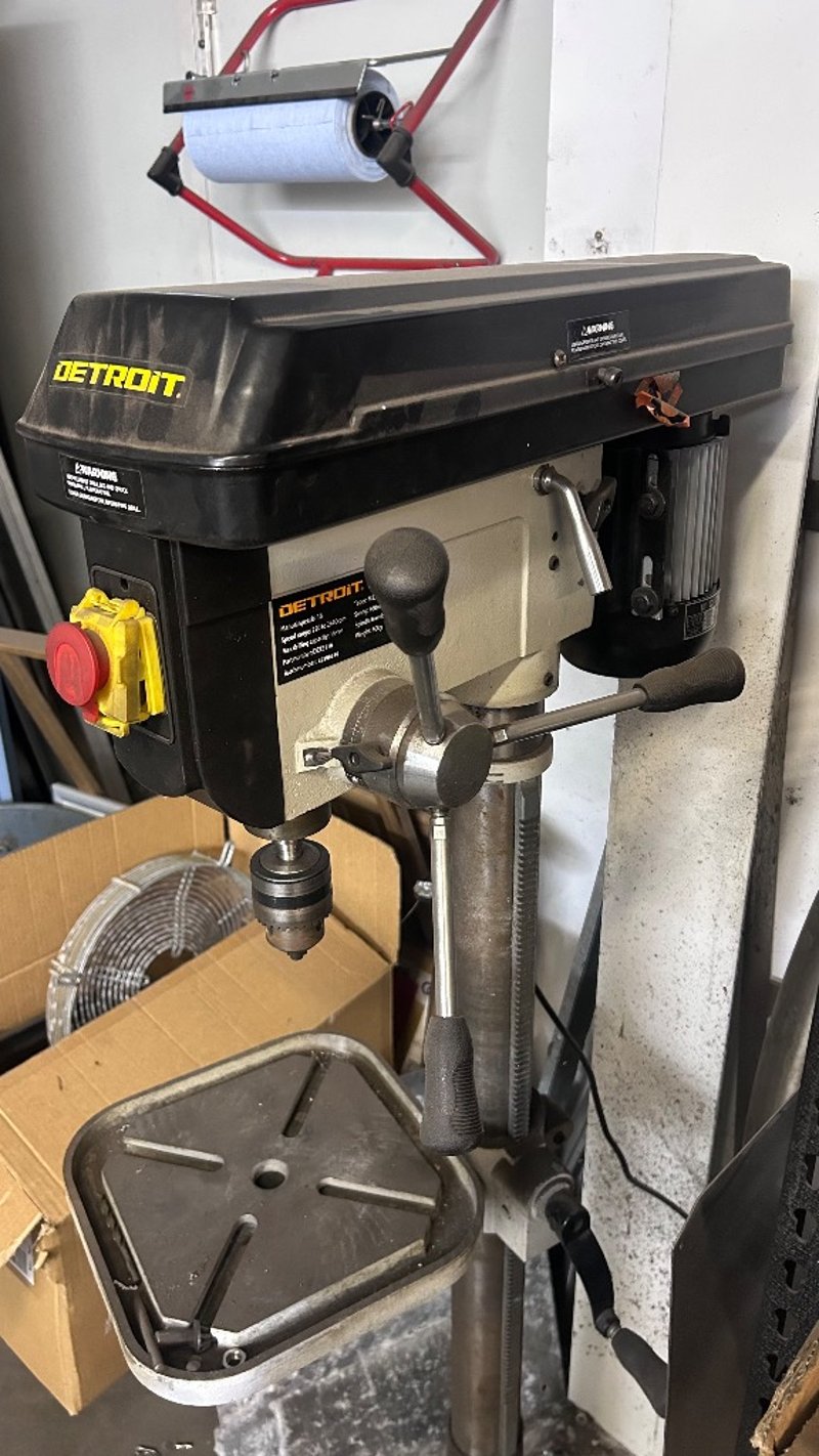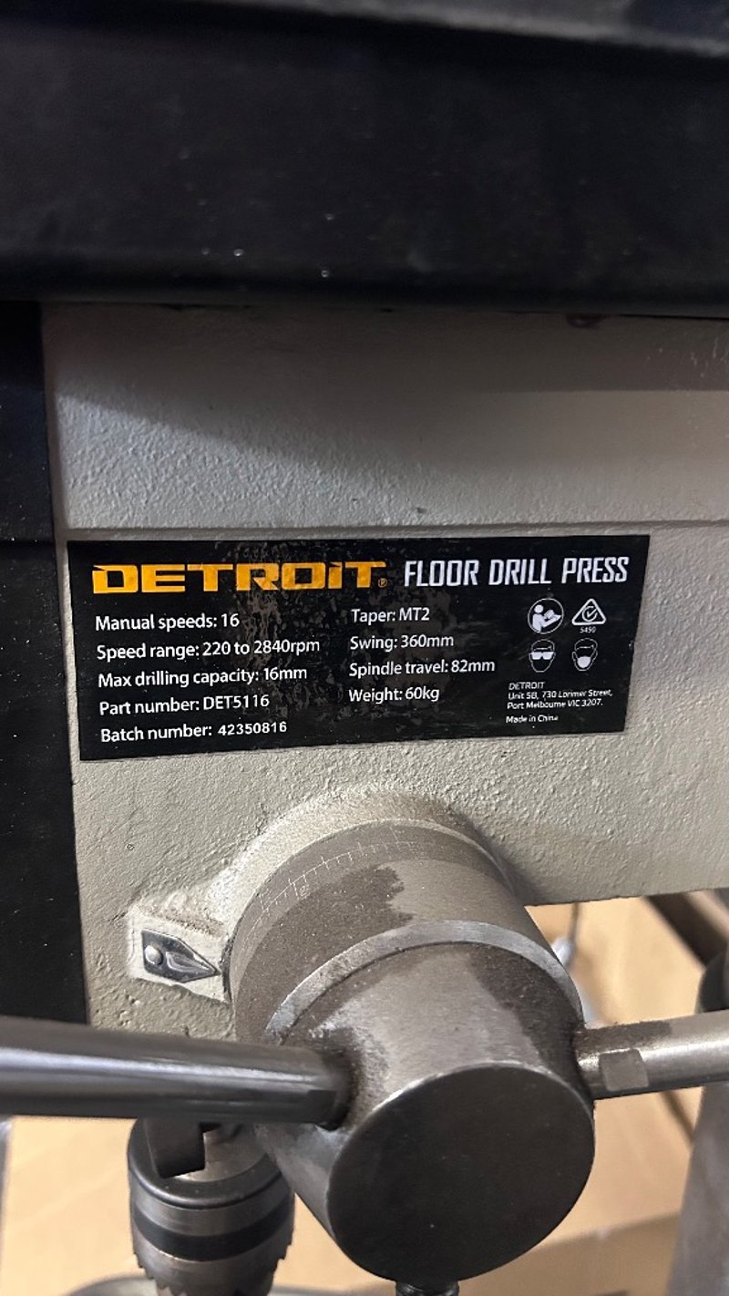 Drill, Detroit, 16 Speed, 2840Rpm, Standing Drill Press.Dimensions: H:126cm x W:48cm x D:60cm.Note: Items In Background Not Included/Will Need to Be Un Bolted From Floor.