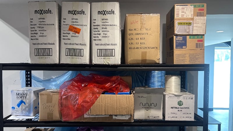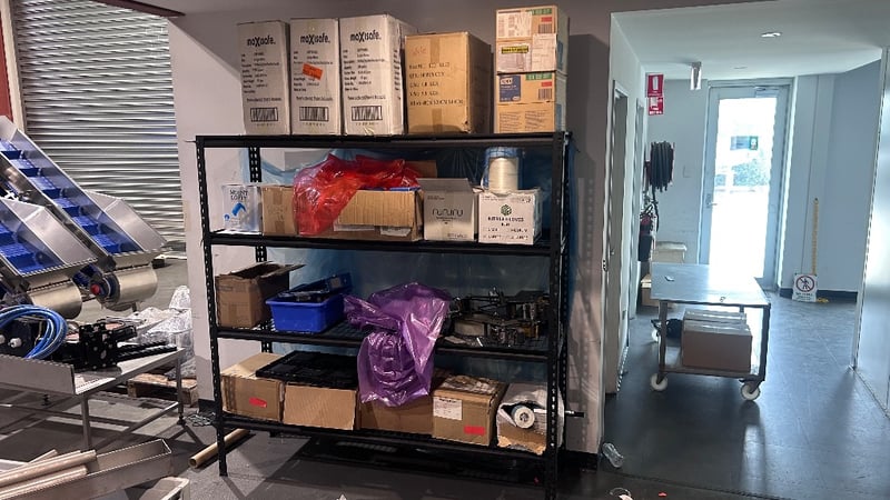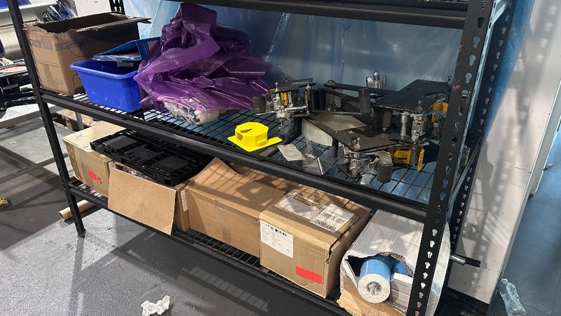 Shelf, Large Steel Shelving Unit, Including Various Packaging Materials & Spare Parts.Dimensions: H:185cm x D:185cm x D:55cm.Sold As Lot.Note: Items In Background Not Incuded.