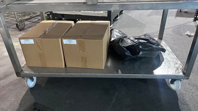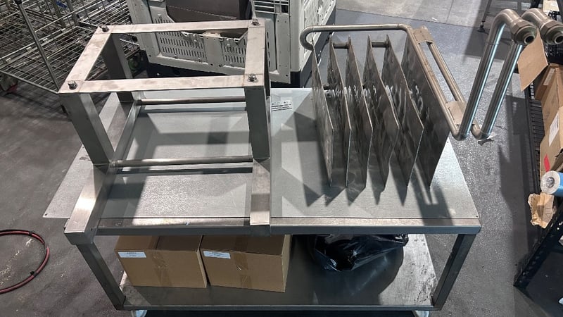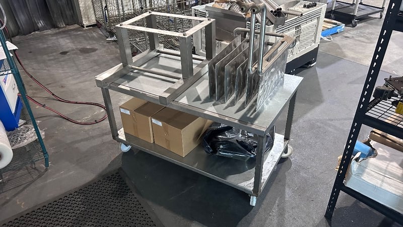 Trolley, Stainless Steel Trolley, Including Various Stainless Steel Parts & Packaging Supplies.Dimensions: H:60cm x W:130cm x D:55cm.Sold As Lot.Note: Items In Background Not Included.