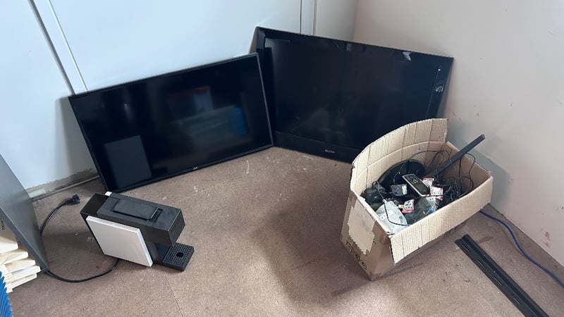 TV, JVC, Sanyo 32inch TV’s, Expressi Coffee Machine, Box Of Various Tech Accesories Such As Phones, Boards Circuitry, Operational Capacity Unknown.Dimensions: H:45cm x W: 67cm x D:15cm.Sold As Lot.Note: Items In Background Not Included.