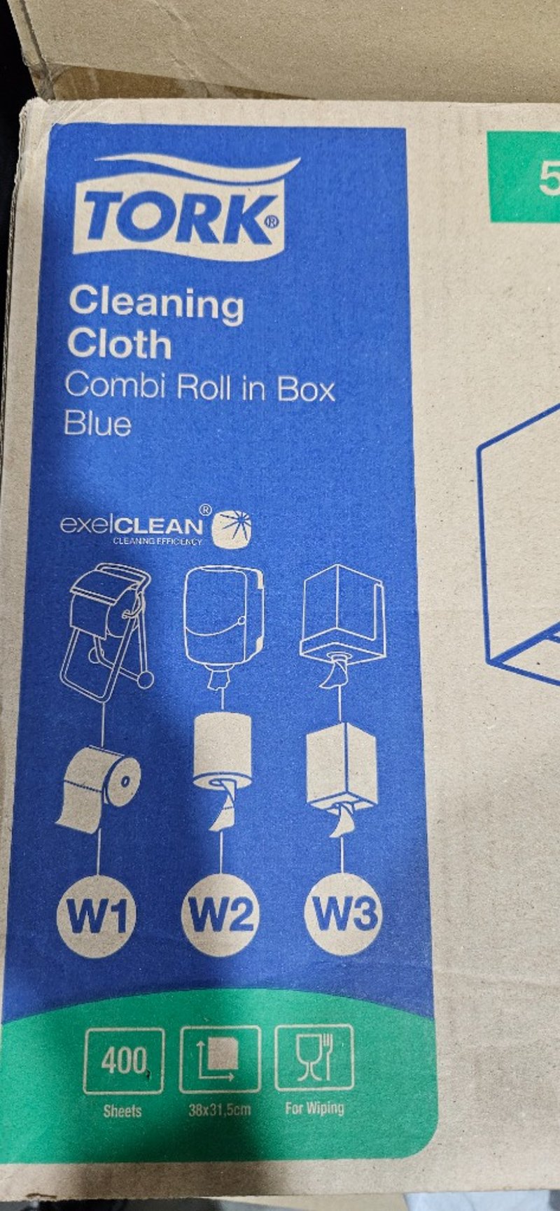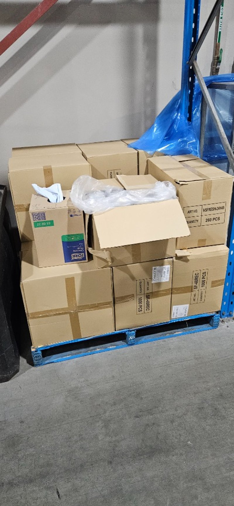 Containers, Pallet of Plastic Food Containers, Tork Cleaning Cloth and more Sold as lot