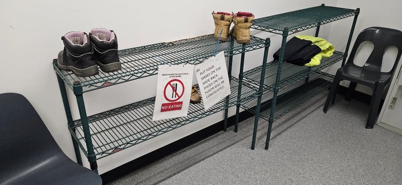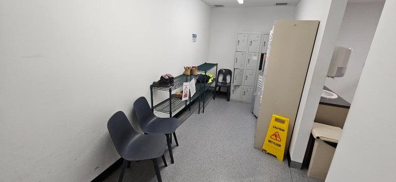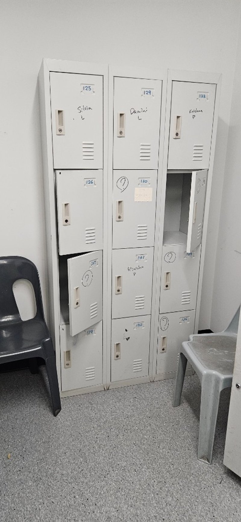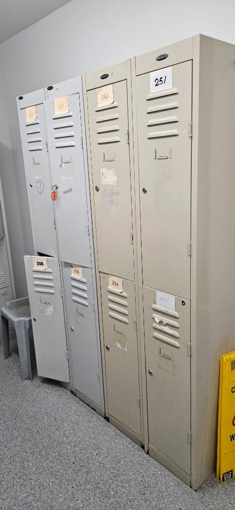 Lockers, Quantity of 2 Tier Lockers with Racking and Chairs.Sold as lot