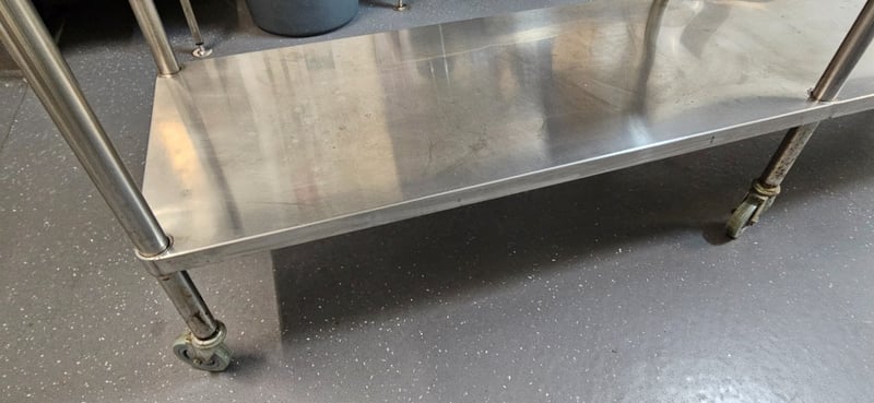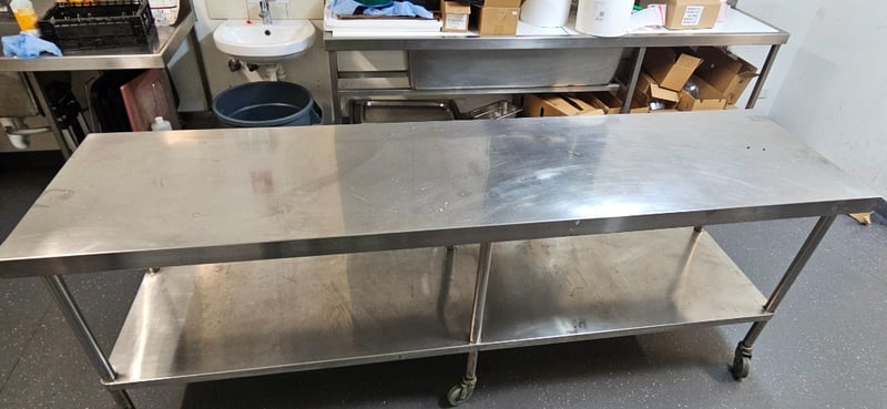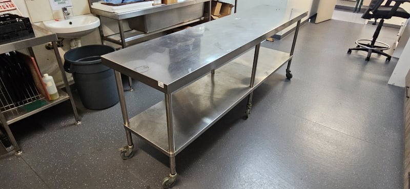 Table, Stainless Steel Table on Wheels, W 240cm D 60cm H 90cm