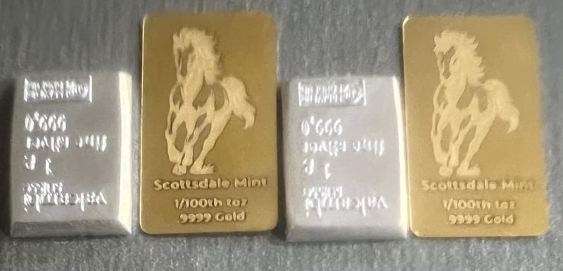 1/100 SCOTTDALE GOLD BAR X 2, 1 GRAM VALCUMBI SILVER BAR X 2 311115+25