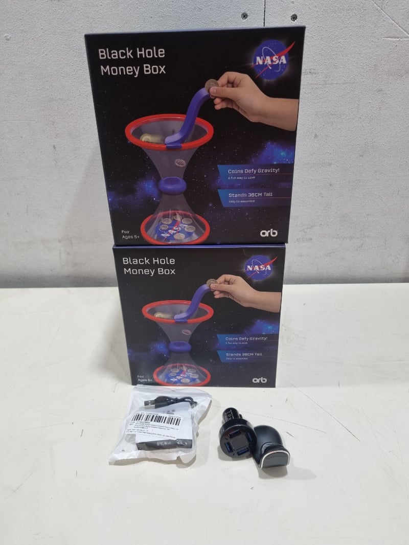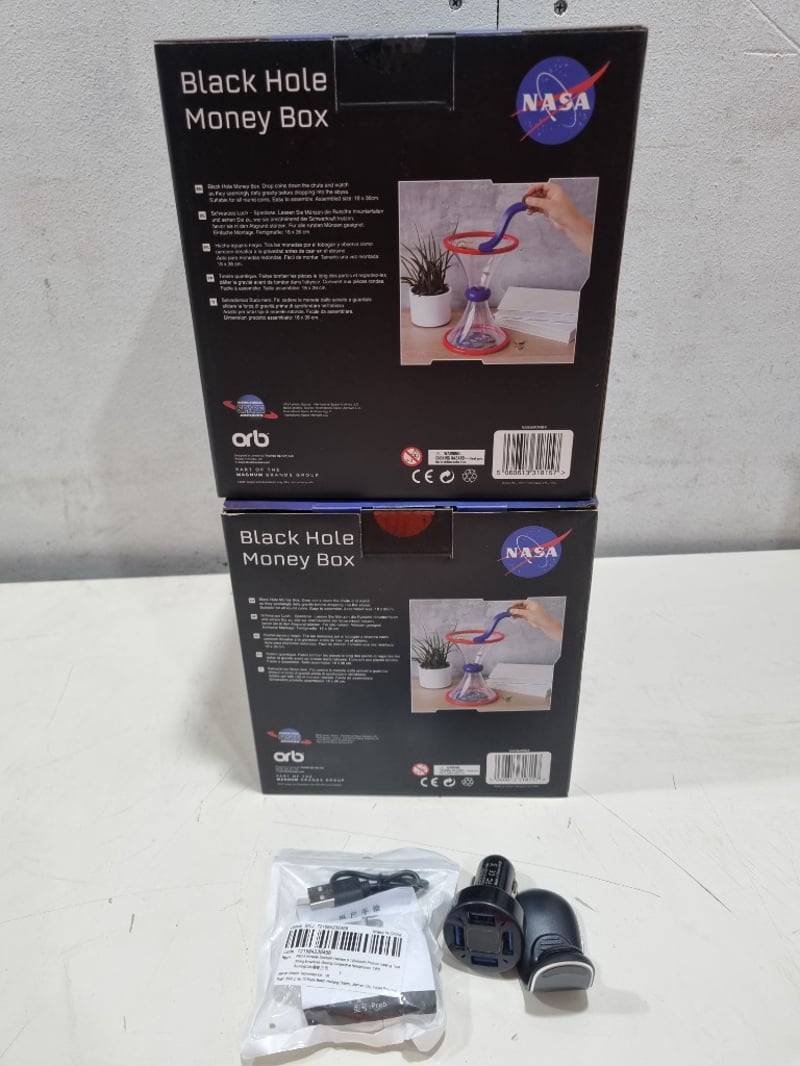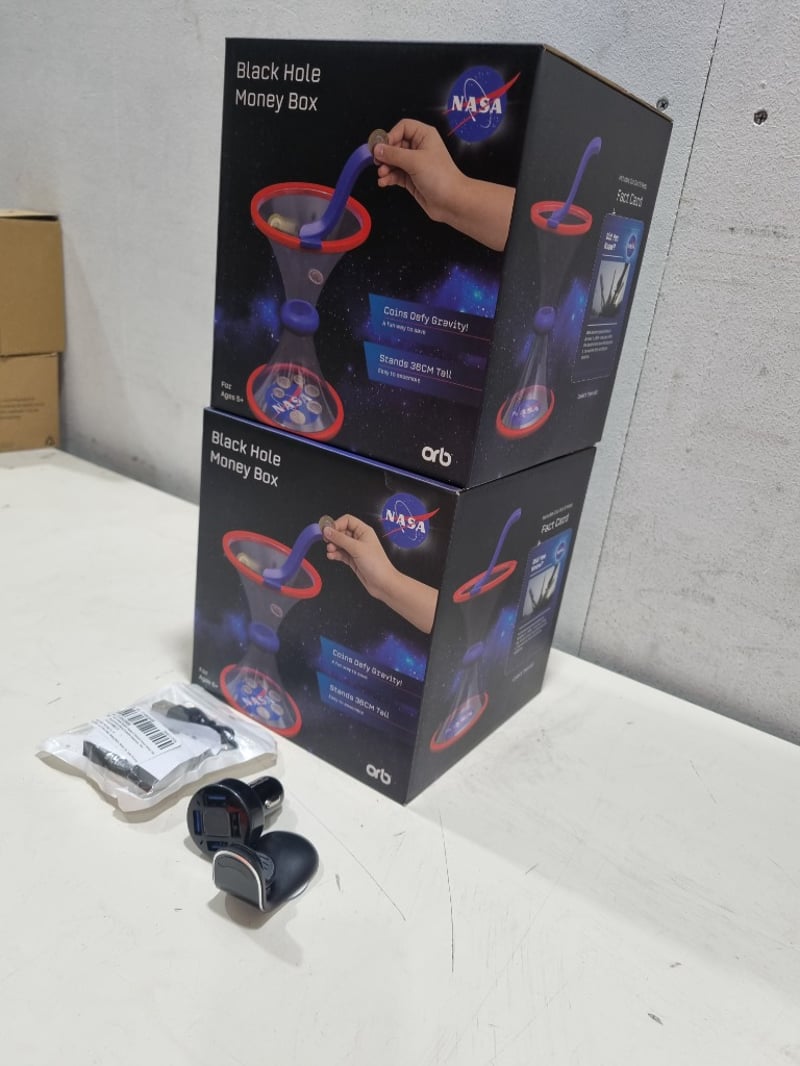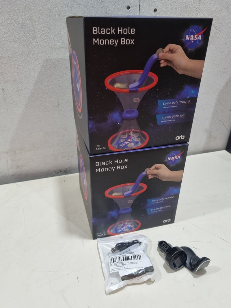 Orb NASA Black Hole Money Box - Dual unit lot comprising two stacking novelty savings boxes featuring gravity-defying coin dispensing mechanism. Each unit stands 36cm tall with red orbital rim and purple funnel-shaped body. Coins deposited into top opening mysteriously "disappear" into the black hole simulation before emerging from the bottom collection chamber. Includes dual USB power adapters and connection cables for illumination features. Educational STEM toy demonstrating gravitational concepts through interactive play. Retail packaging with NASA branding intact. Age 6+. Ideal for space enthusiasts and collectors.