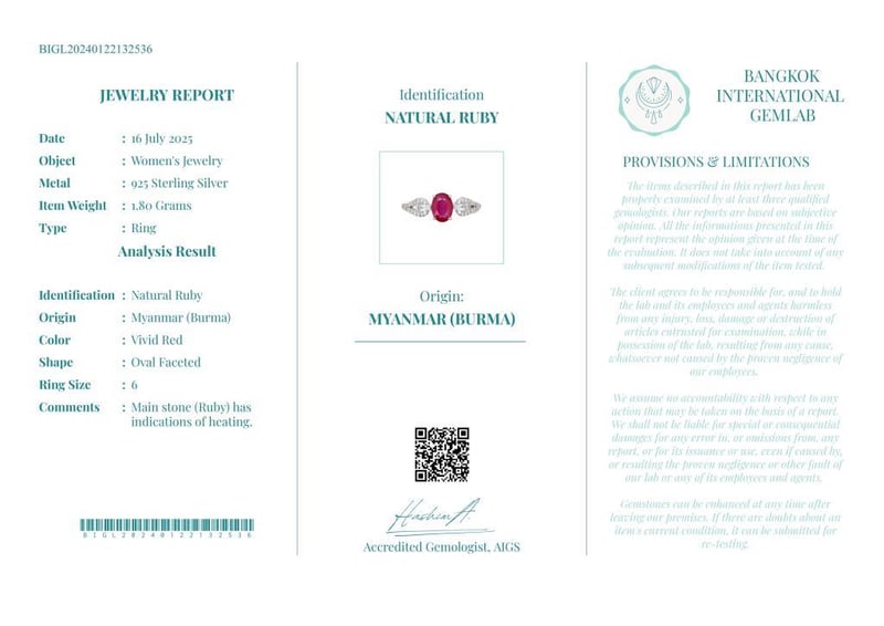 NATURAL BURMESE RUBY RING ON 925 SILVER - WITH DIGITAL CERTIFICATE ONLY Gemstone : Natural Burmese RubyCertificate (Digital): Bigl20240122132536Item Total Weight : 1.8 GramsMain Stone Color : Vivid RedSize : 6Comments : Main Stone (Ruby) Has Indications Of Heating.✻ Verify Report Online At Www.Bangkokinternationalgemlab.Co Condition: Good - Refer Images 01611137+5