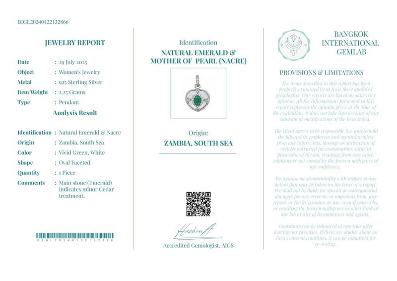 Comments : Main Stone (Emerald) Indicates Minor Cedar Treatment.