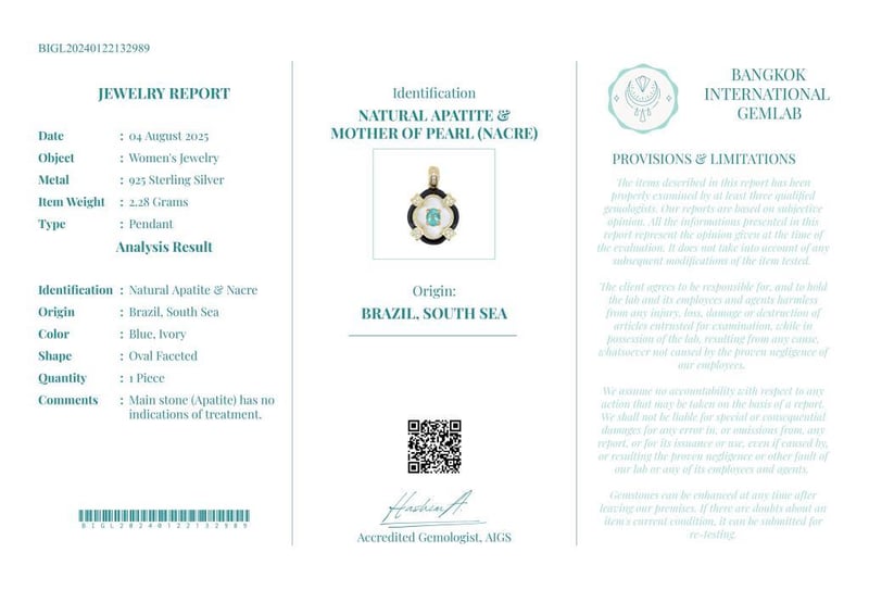 NATURAL APATITE & MOTHER OF PEARL (NACRE) PENDANT ON 925 SILVER - WITH DIGITAL CERTIFICATE ONLY Gemstone : Natural Apatite & Mother Of Pearl (Nacre)Certificate (Digital): Bigl20240122132989Item Total Weight : 2.28 GramsMain Stone Color : Blue, IvorySize : Comments : Main Stone (Apatite) Has No Indications Of Treatment.✻ Verify Report Online At Www.Bangkokinternationalgemlab.Co Condition: Good - Refer Images 01611137+35