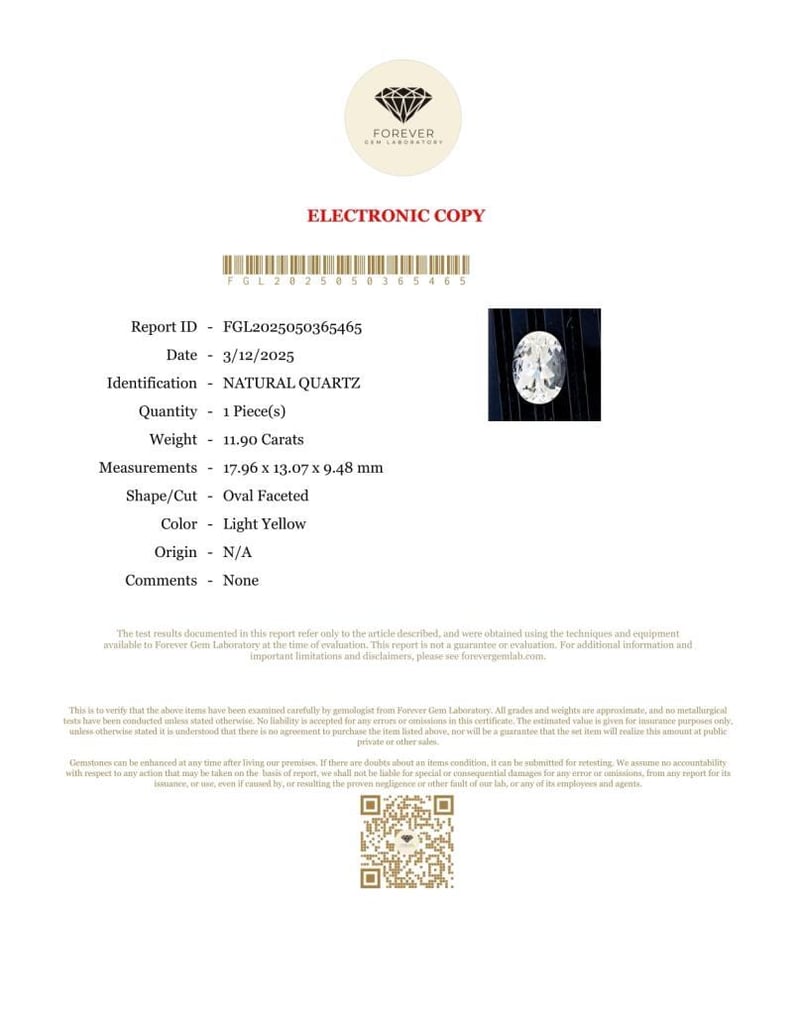 11.90 CARATS NATURAL QUARTZ 11.90 Carats Natural Quartz Certificate Number - Fgl2025050365465 Color - Light Yellow Shape - Oval Faceted Dimension - 17.96 X 13.07 X 9.48 Mm Origin - N/A Comments - None Good Quality With Luster Condition: Good - Refer Images 0 160772+76