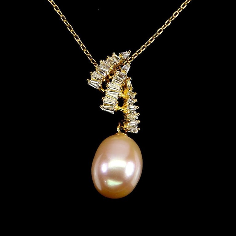 Natural Golden Freshwater Pearl Necklace. Made In Solid Sterling Silver And Plated In14K Yellow Gold. Features Natural Fresh Water Golden Pearl And Sparkling Czs. Chain Measures 18 Inches.