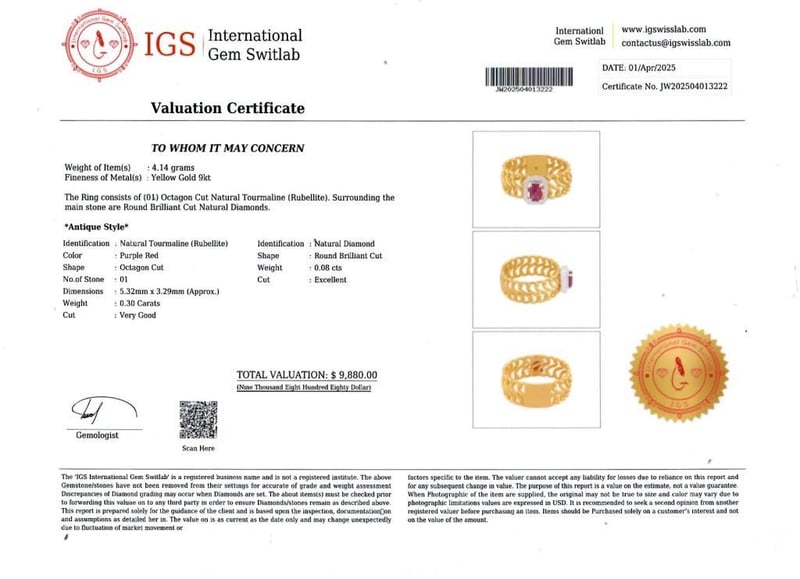 9CT YELLOW GOLD RUBELITE AND DIAMOND RING Date : 27 -03-2025 Category: Ring Comment: Yellow Gold 9K Natural Rubellite : 0.30 Carat Natural Diamond : 0.08 Carat Item Weight : 4.14 G Condition: Good - Refer Images 13222488285+13222