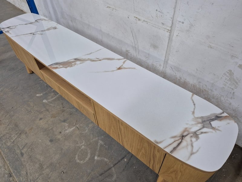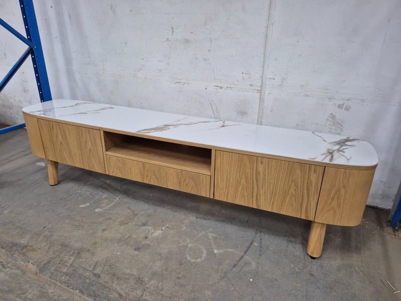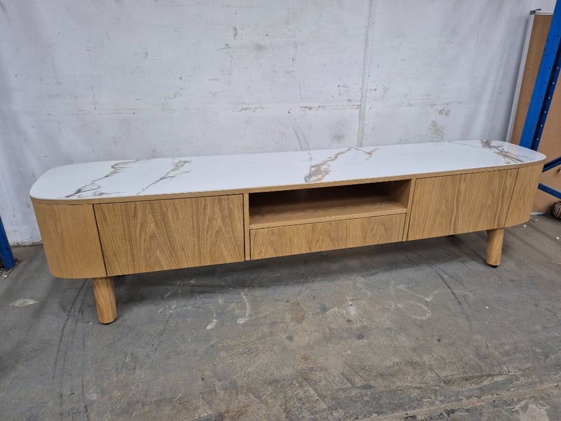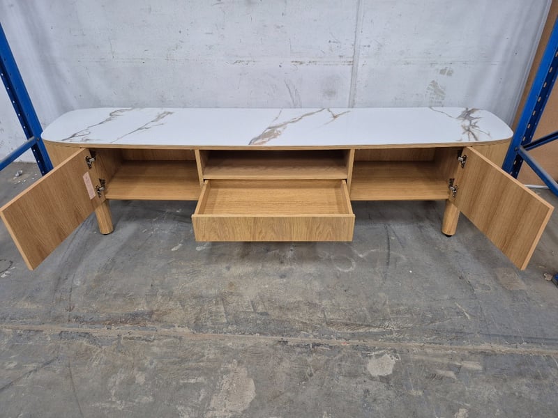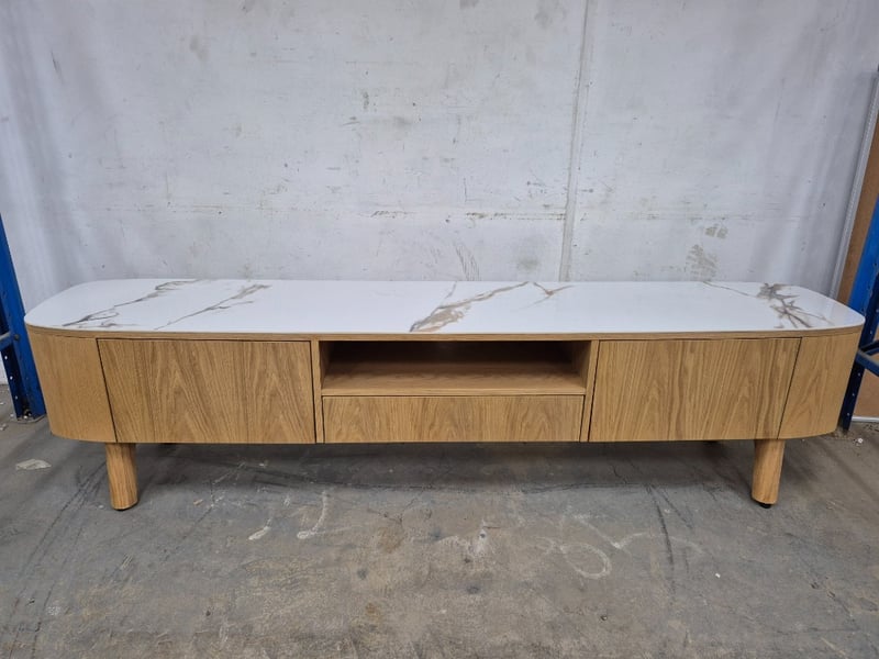 Entertainment Unit, Double Door, Pop Out Drawer, Marble Top, Timber Body. Approx Dimensions H56 x W220 x D44