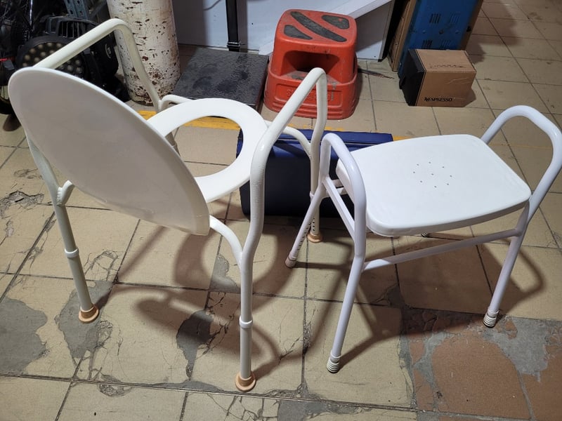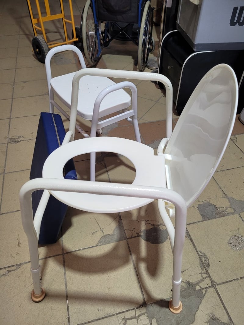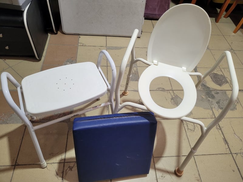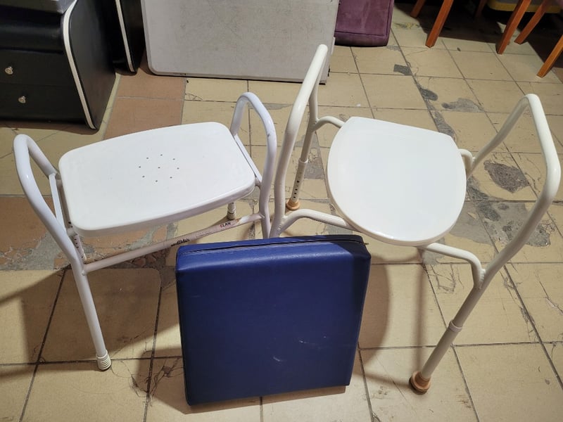 Adjustable Raised Toilet Seat with Armrests, Adjustable Shower Stool with Armrests, Blue CushionDimensions Toilet Seat H:76cm W:55cm D:45cmDimensions Shower Stool H:65cm W:54cm D:42cmDimensions Cushion H:9cm W:45cm D:45cmSOLD AS LOT