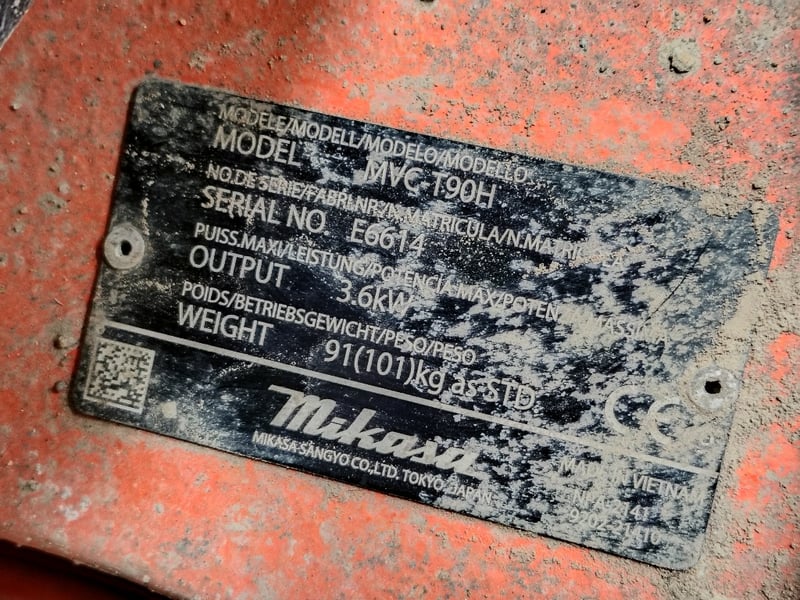 Mikasa MVC-T90H Plate Compact Serial: E6614 Weight : 91 kgs Output : 31 kW Location: Mornington, VIC Contact: Gage Mackay - 0458 732 549 or [email protected]