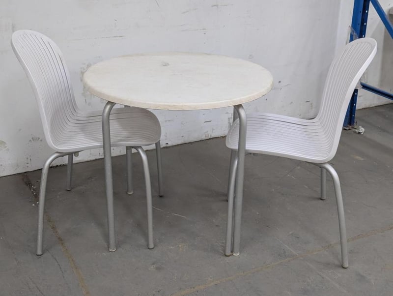 Outdoor Setting, Table and 2 Chairs Note: one chair has slight damage - refer to images Dimensions Table: H 72cm x W 80cm x D 80cm Dimensions Chairs: H 88cm x W 50cm x D 51cm SOLD AS LOT