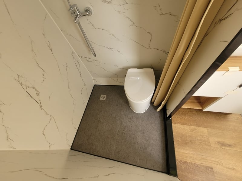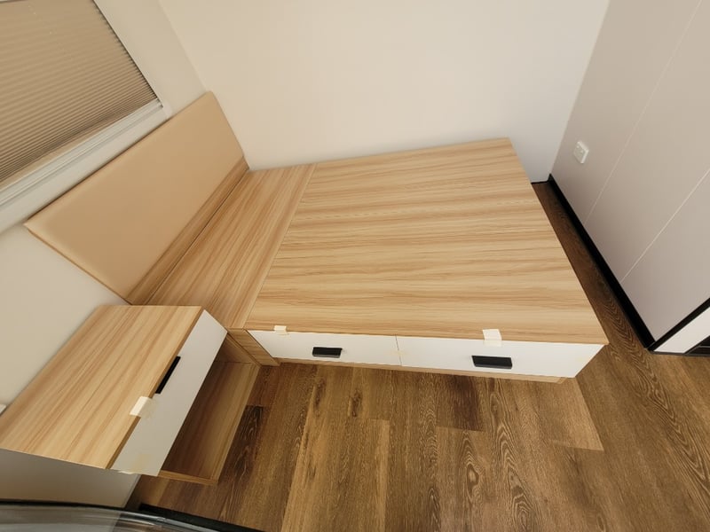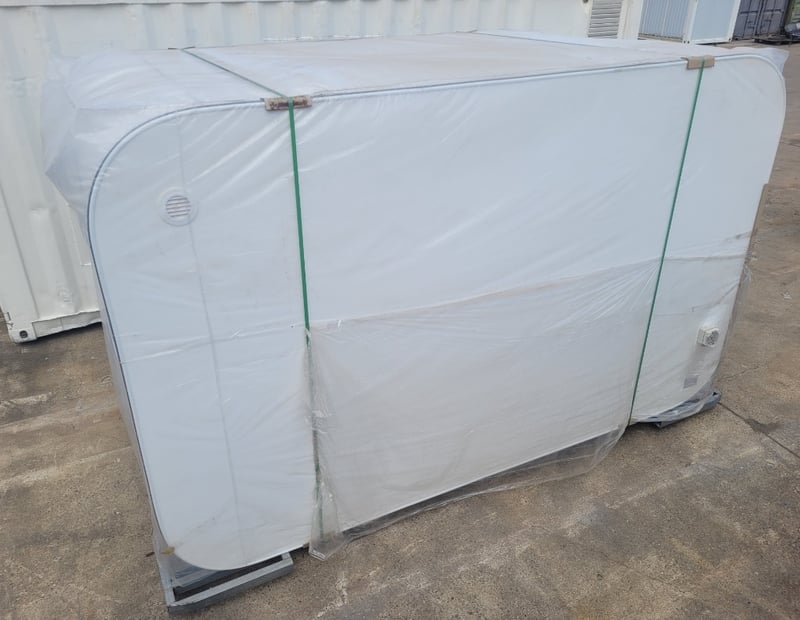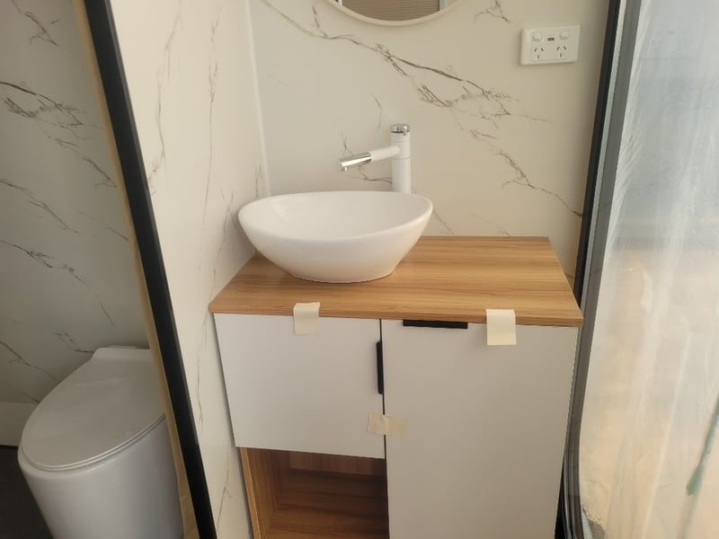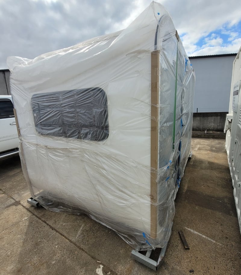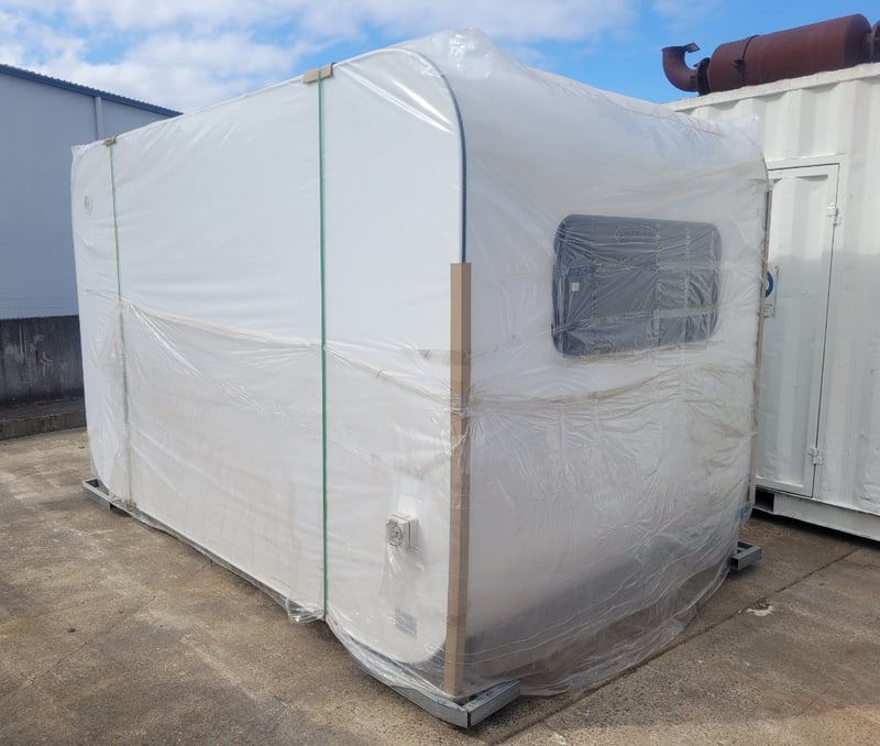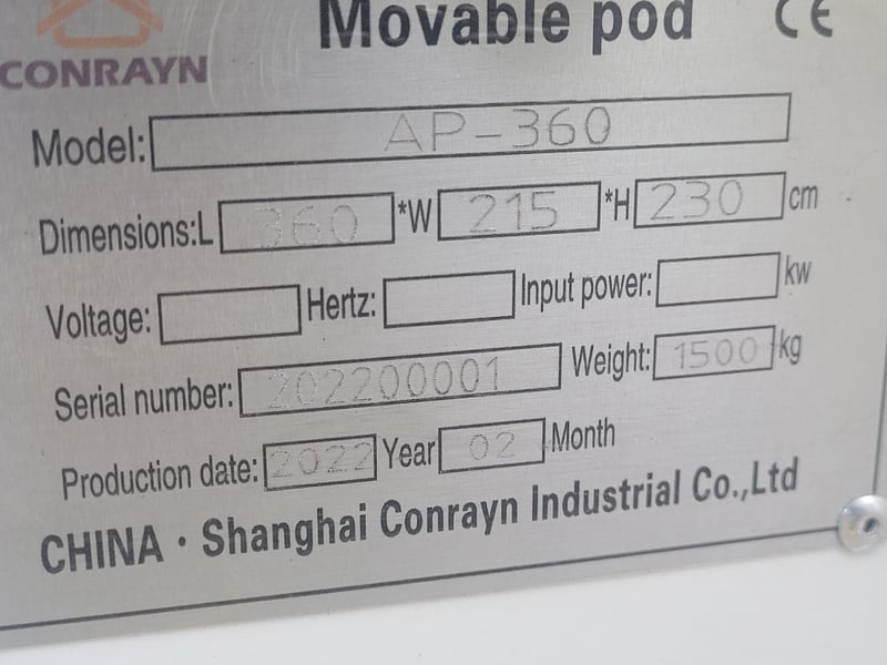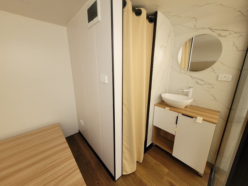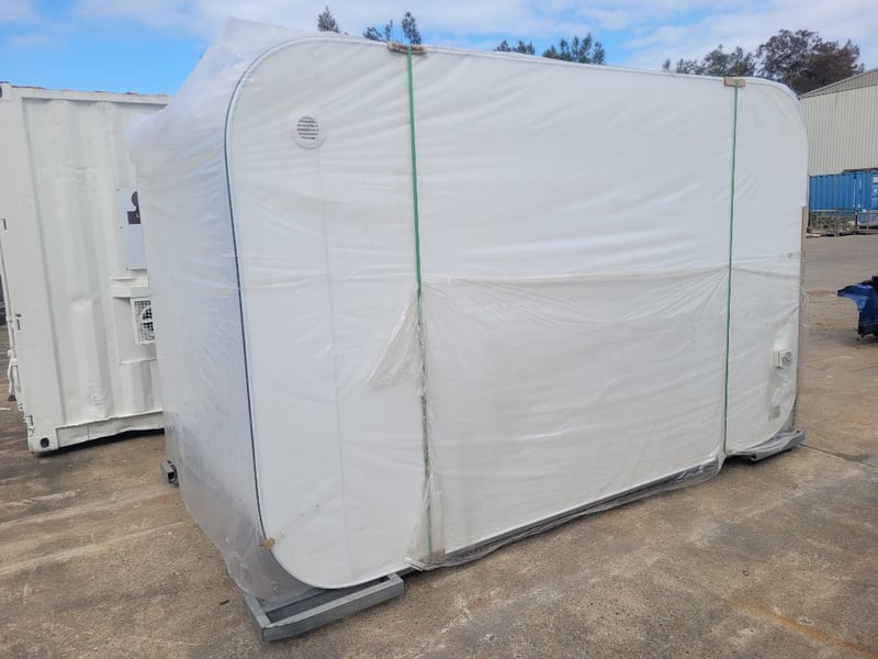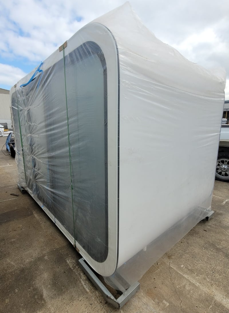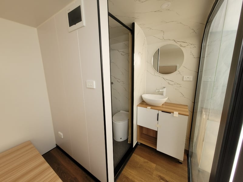 Description: Pod on steel skid, double bed, shower, toilet, hand wash basin, internal power points, and lights, external power connection point, tinted windows, external side asceses door.