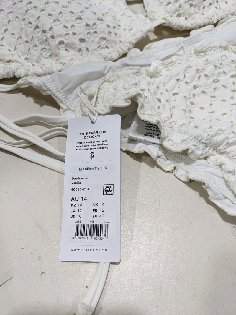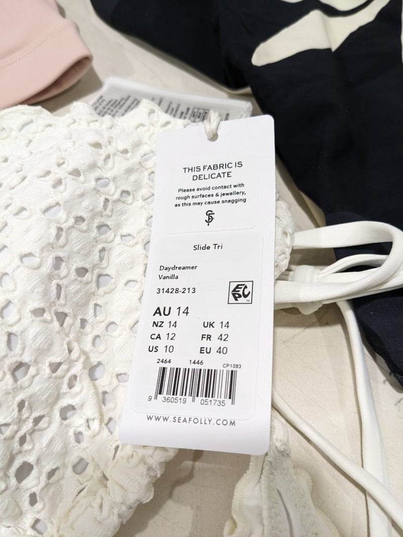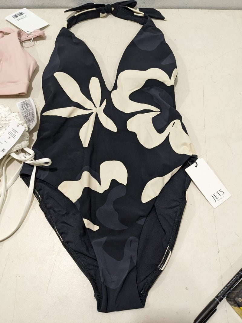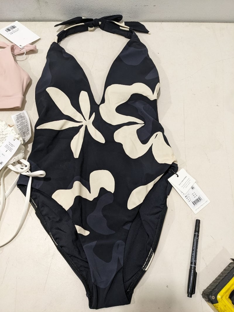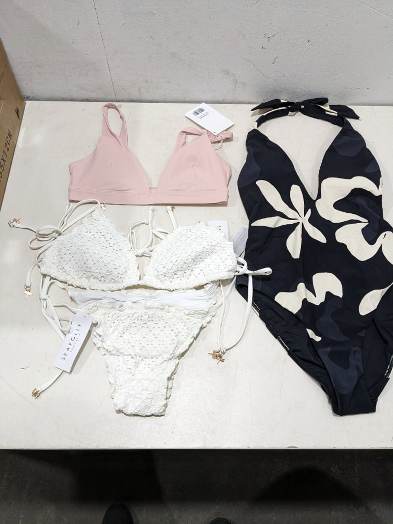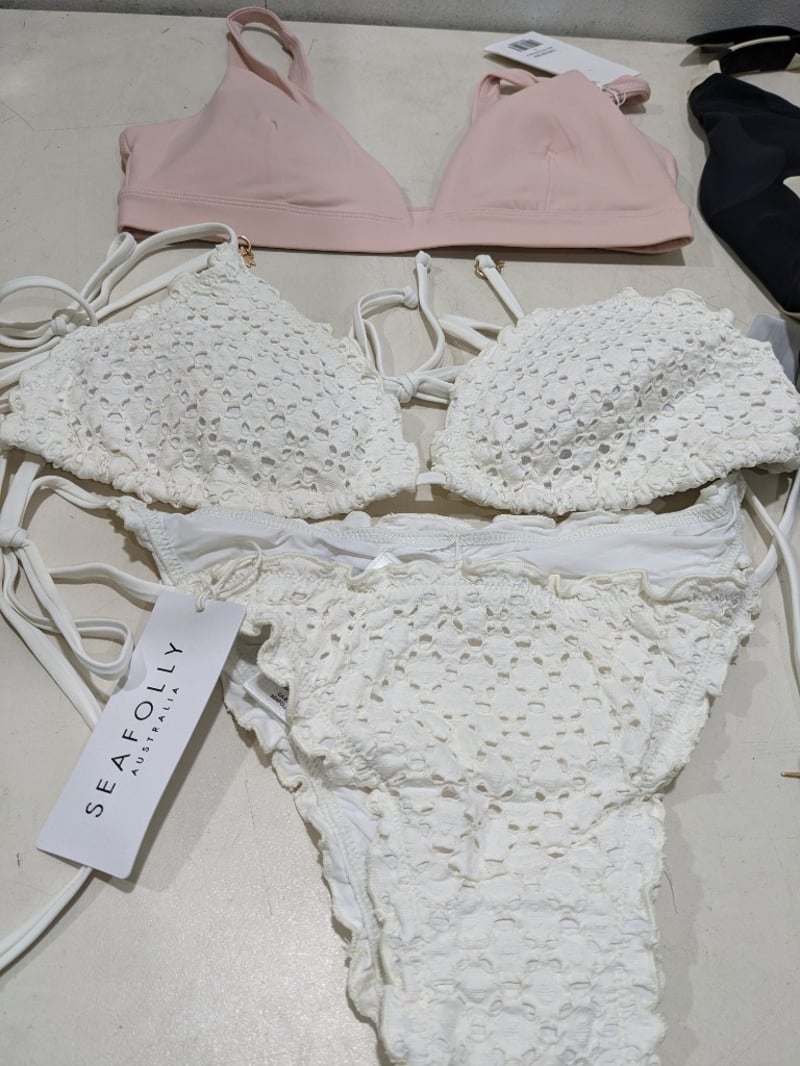Assorted clothes includes, white bikini size 14, monokini size 12 and more..