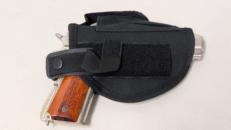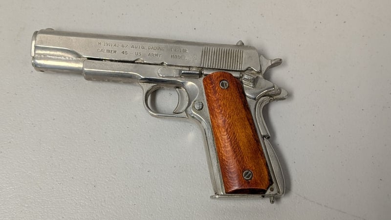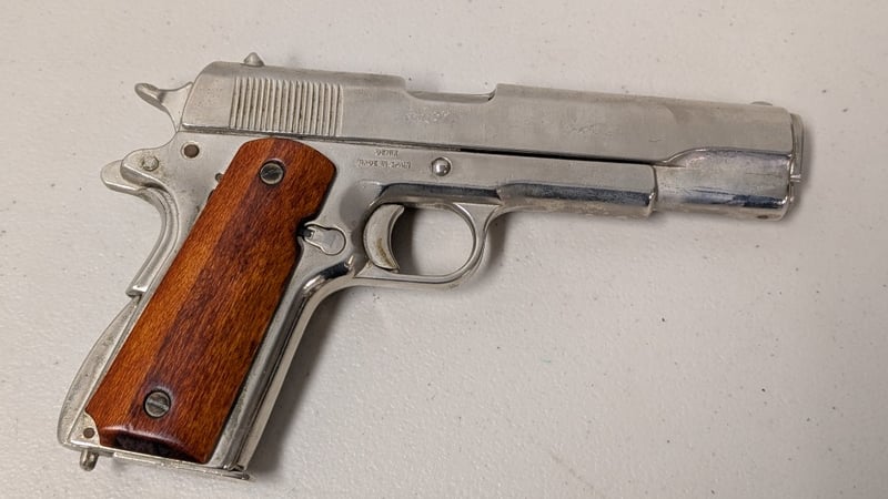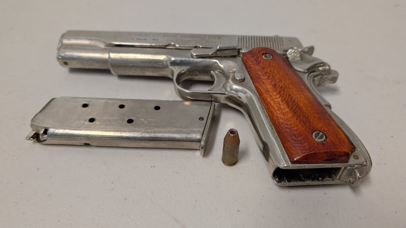 COLT 1911 45 CALIBER HANDGUN WITH HOLSTER Denix Replica. Full Metal With Wooden Grips And Nickel Finish. Magazine Has Inert Rounds. Condition: Good - Refer To Images SR 562185+2