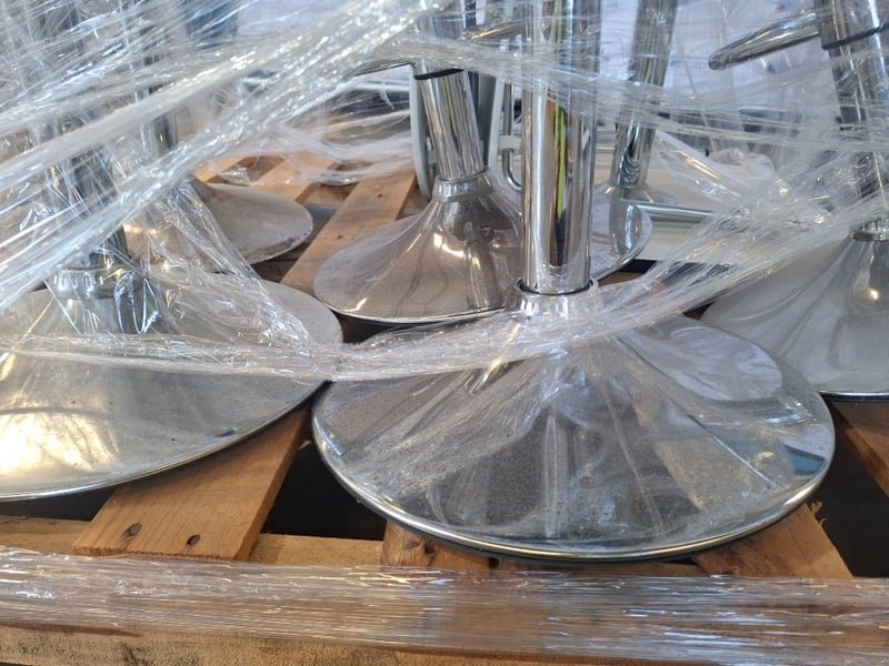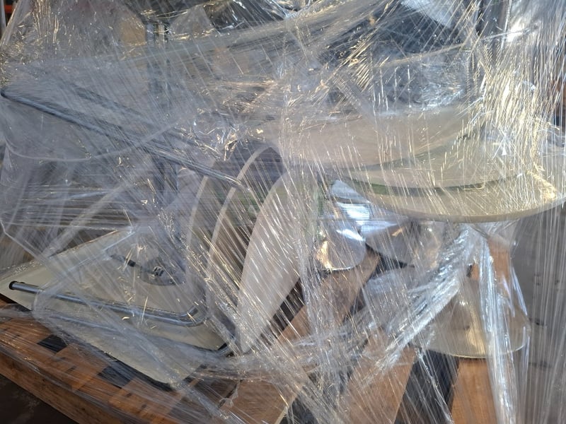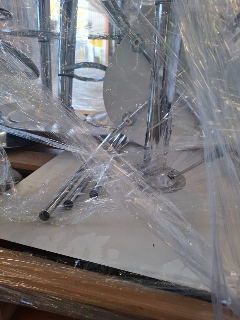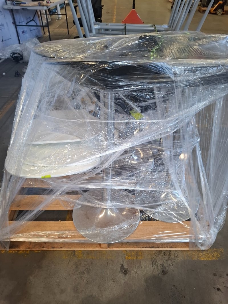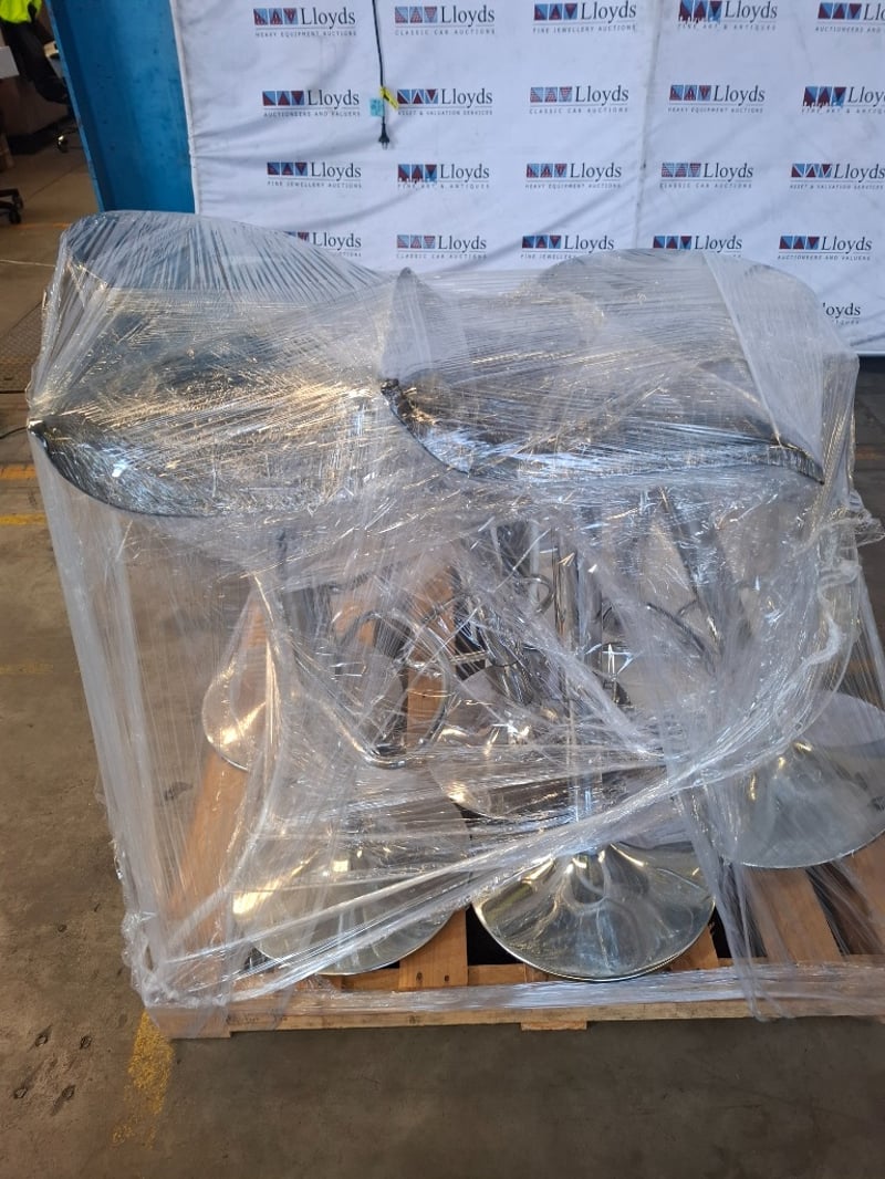 Assortment pallet of 3 high chairs metal round base with leather style square top, 3 x high chairs metal round base with black round plastic top, 3 x white hard plastic top with metal frame dinning chairs and 1 x table white timber top with metal round base SOLD AS LOT