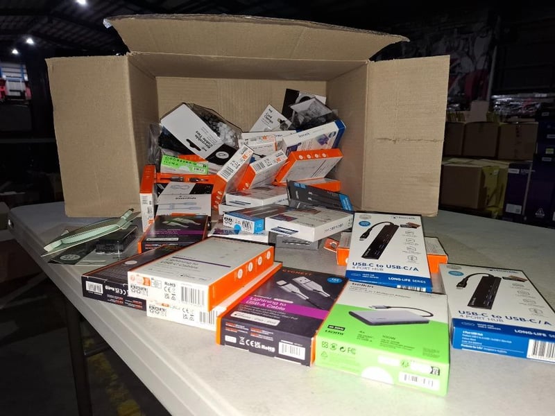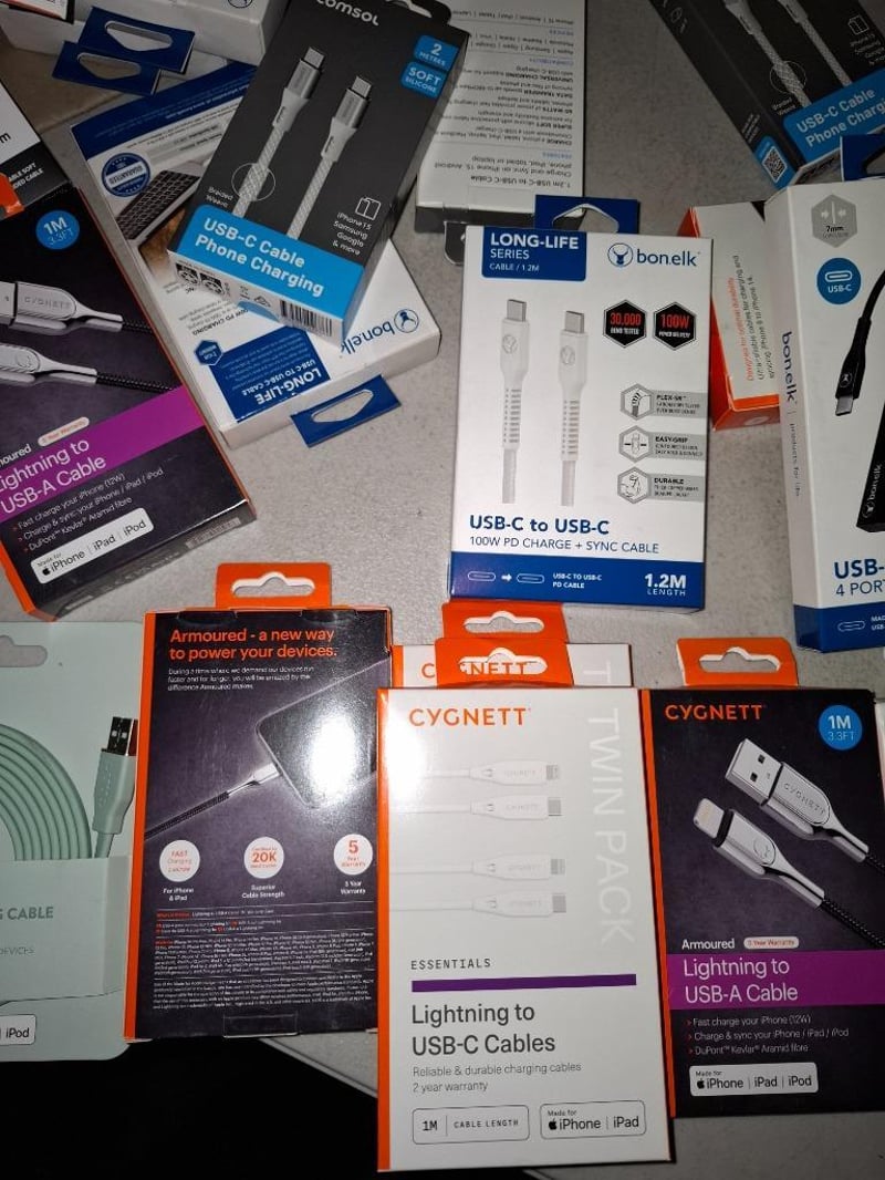 Assortment box of cables includes, USB - C 4 in 1 Multiport adapter , USB - C to USB -C/A 4 Port hub , 1M Lightning to USB -A cable and more