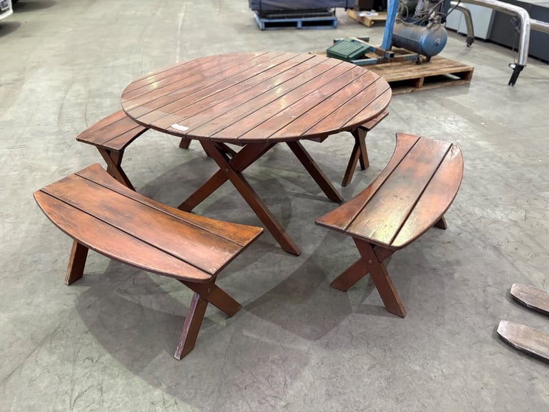 Round Wooden Outdoor Table with 4 Matching Curved Benches