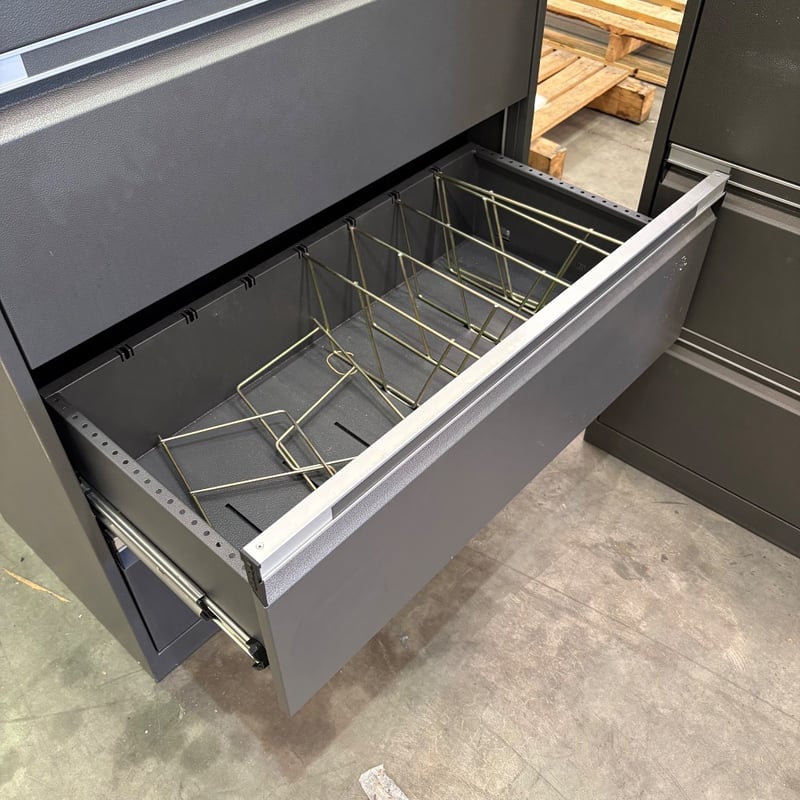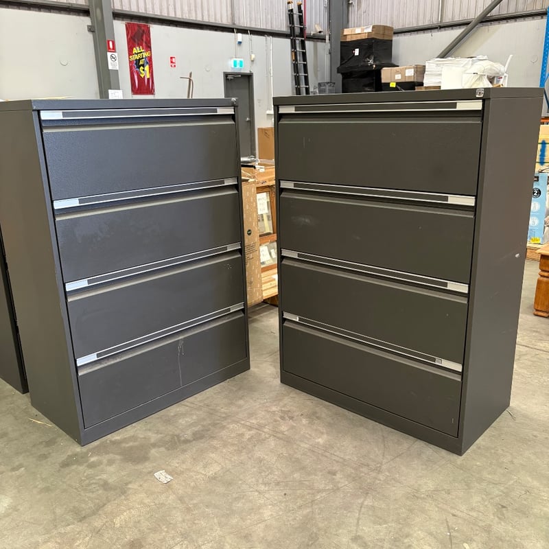 2 x 4-Drawer Metal Filing CabinetsHeavy-duty office filing cabinets featuring four drawers each with integrated handles and internal hanging file frames. Finished in dark grey with smooth sliding drawers.Note: General surface wear and scuffs consistent with use. Sold as lot.