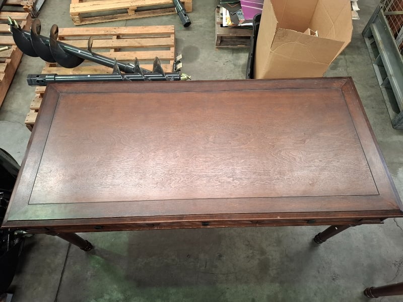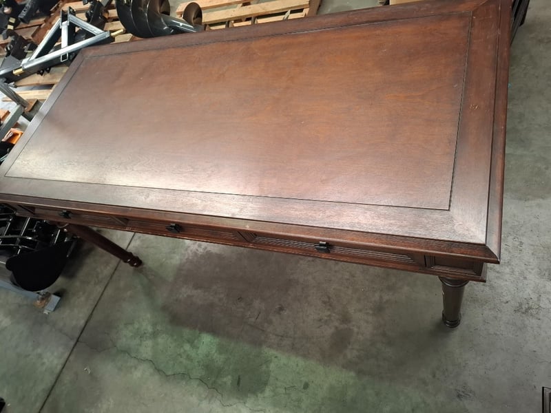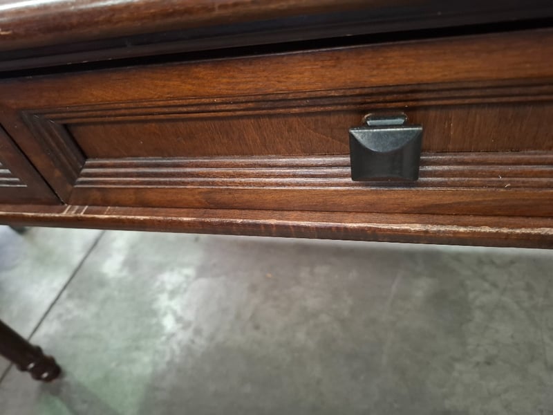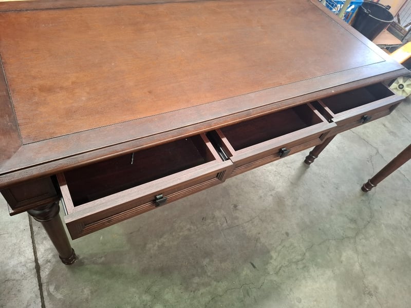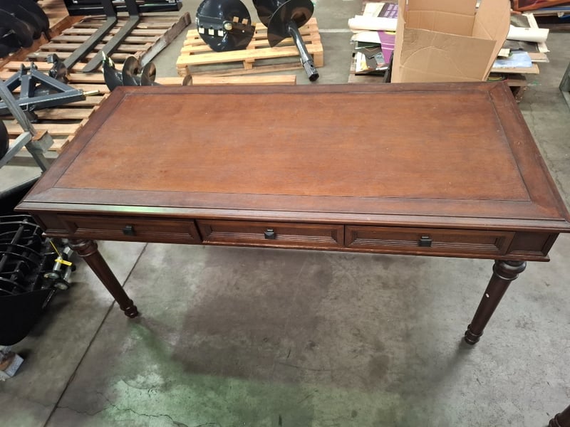 Dark oak finished timber desk table , 3 drawersDimensions: 160 cm W x 76 cm D x 77 cm HNOTE: MINOR SCUFFS, WEAR AND TEAR