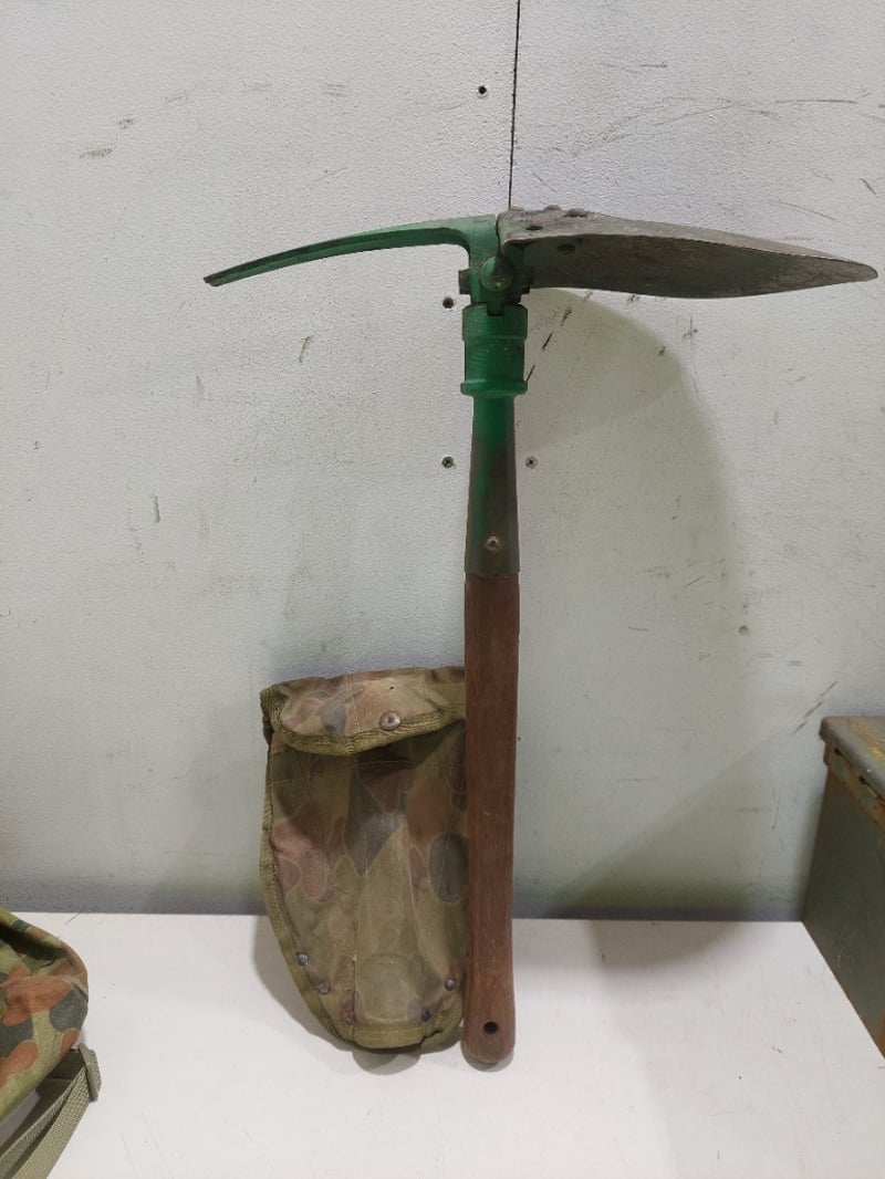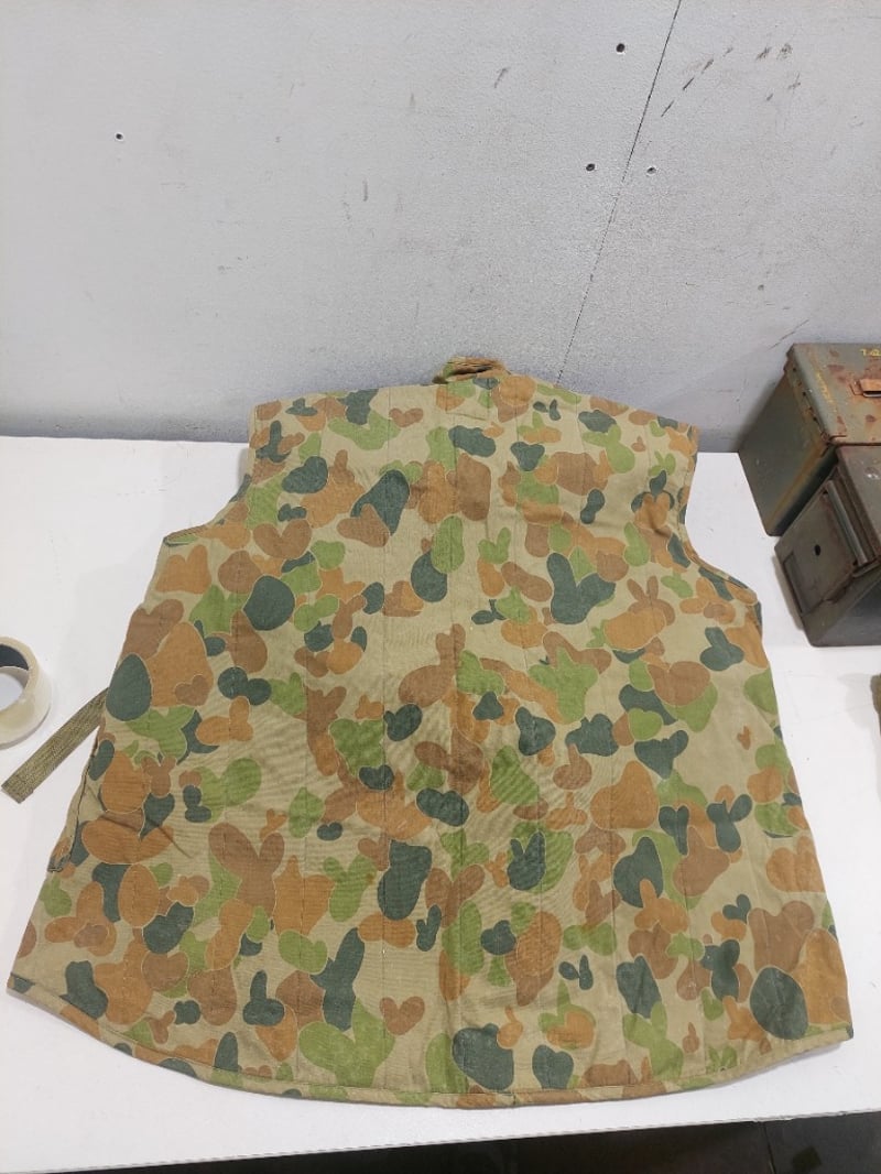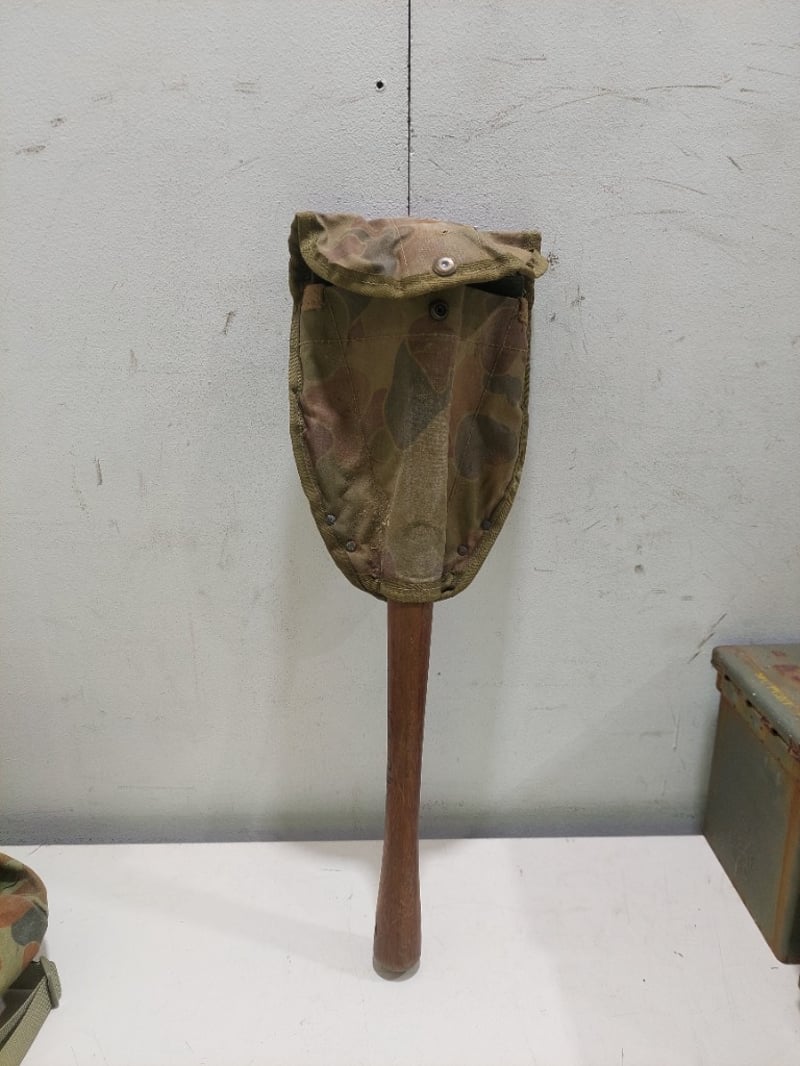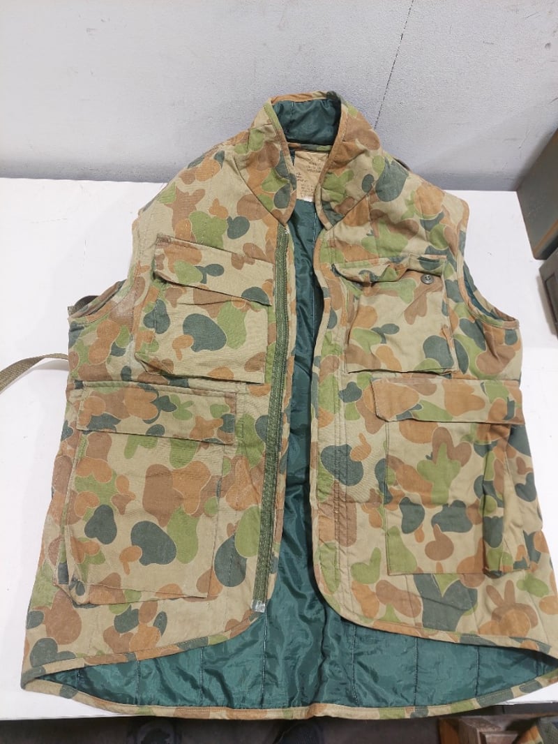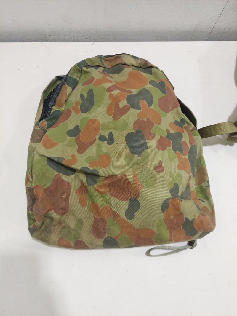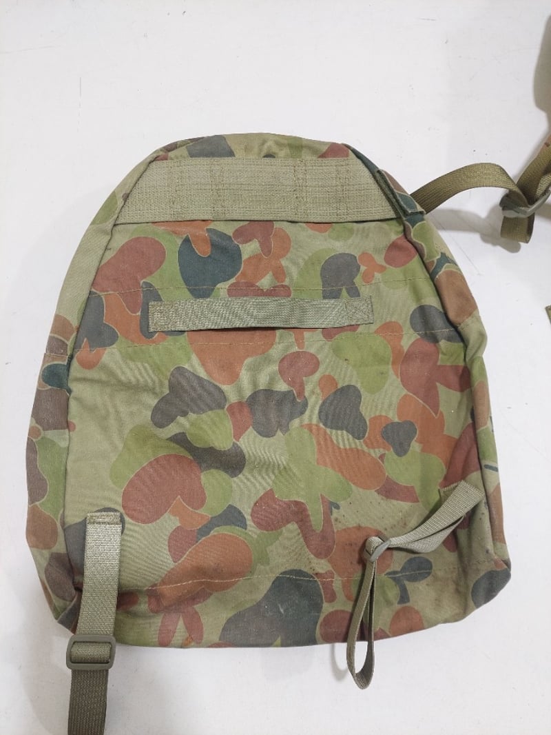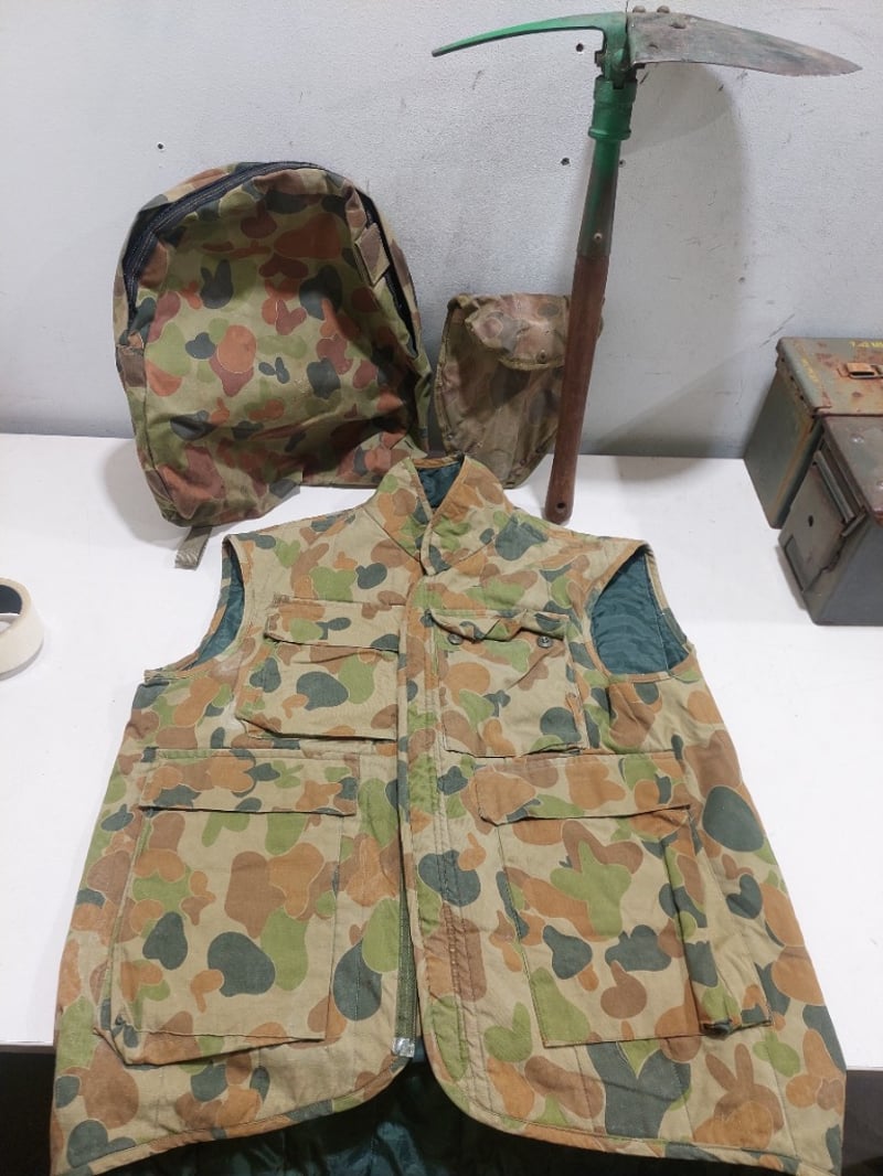 Australian Army AUSCAM ranger vest, Australian Army DPCU (Disruptive Pattern Camouflage Uniform) day pack and military-style entrenching tool, also known as a folding shovel.Sold as a lot