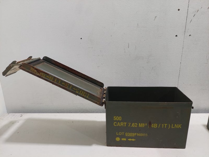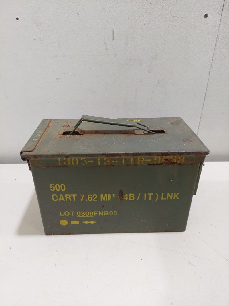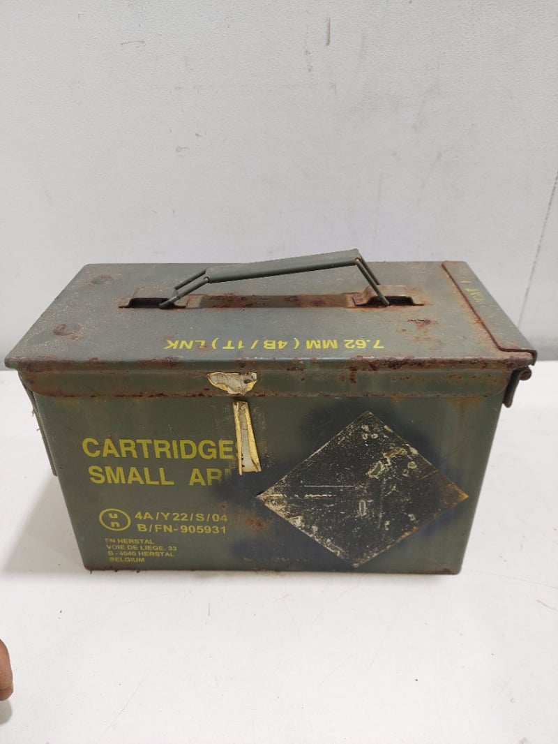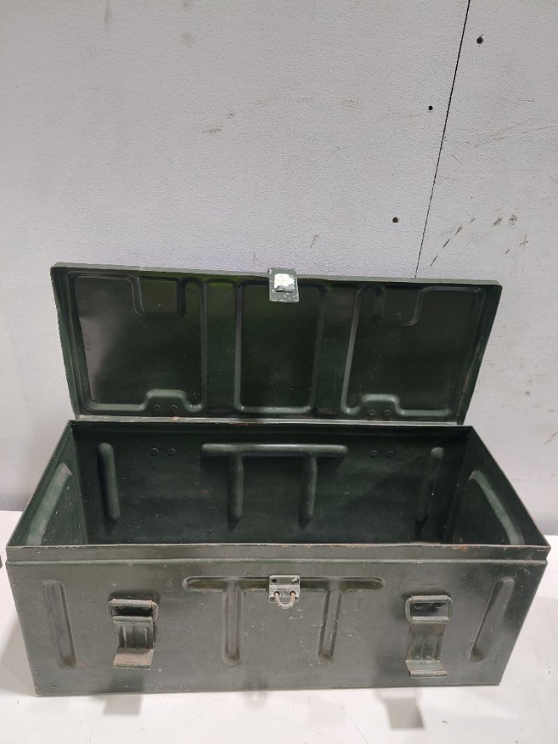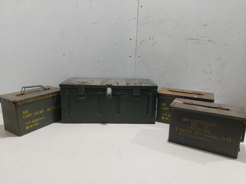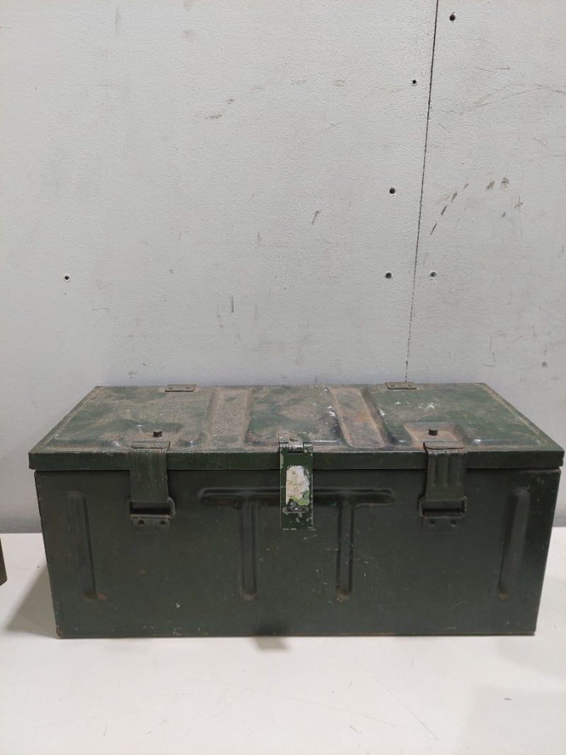 Military items, including military surplus ammunition cans and metal storage container.Sold as a lot.