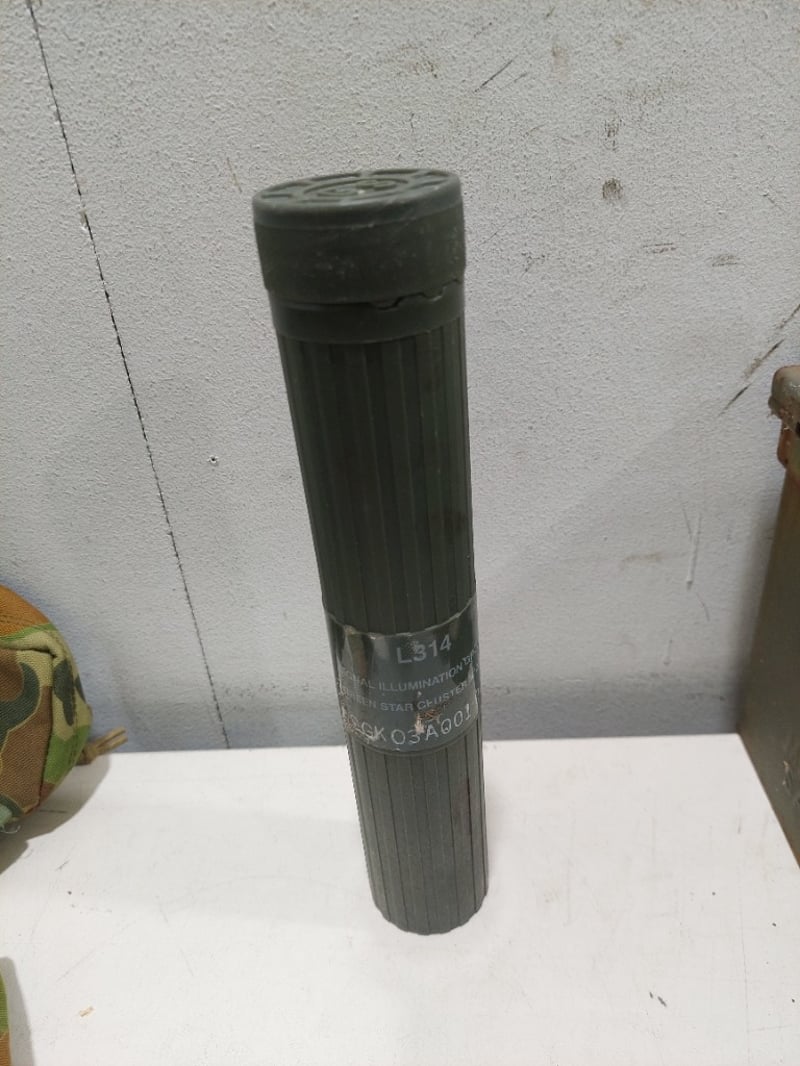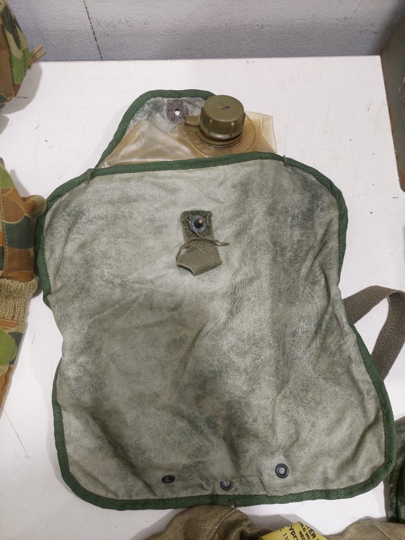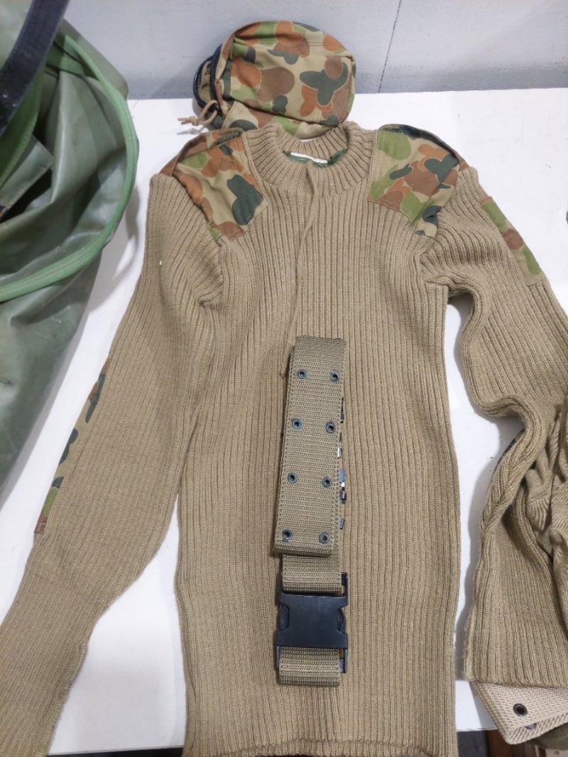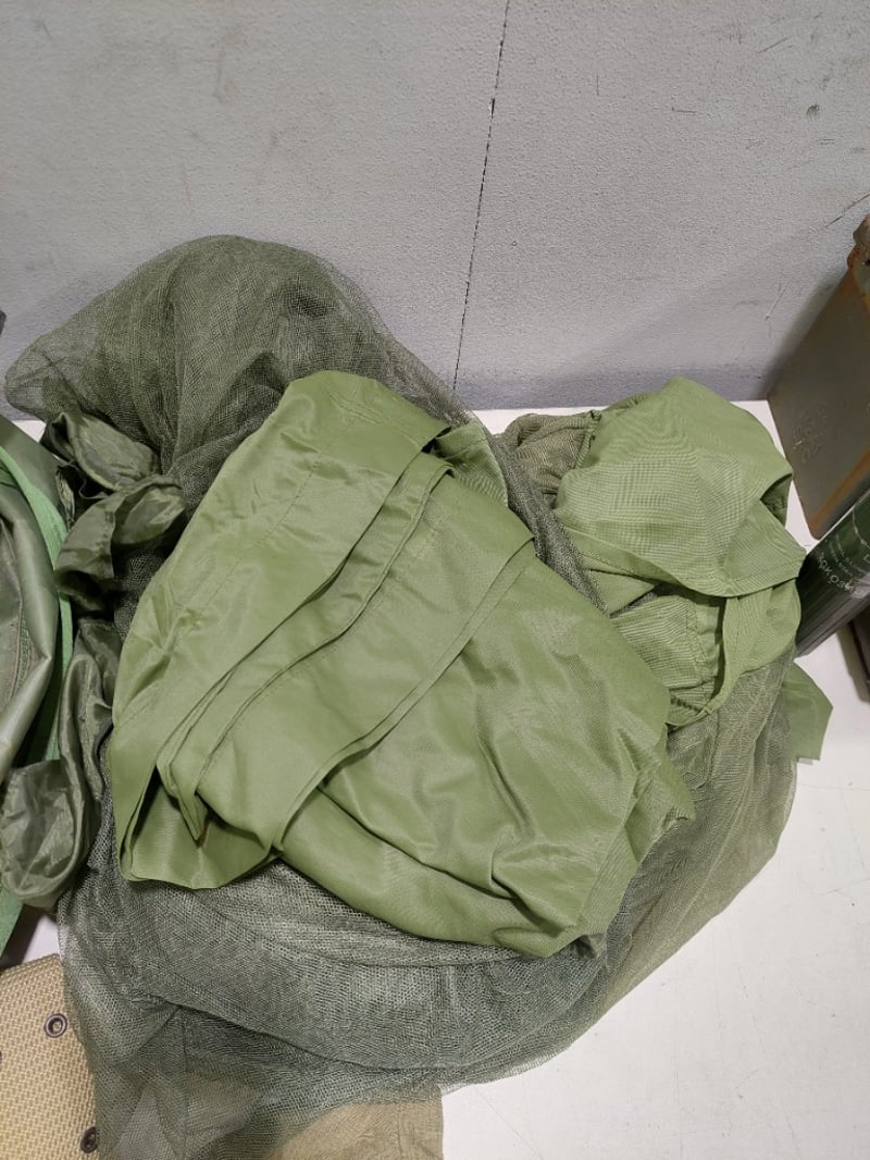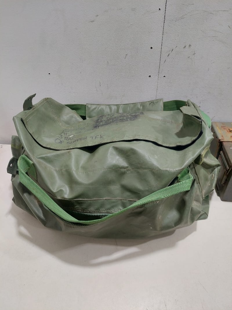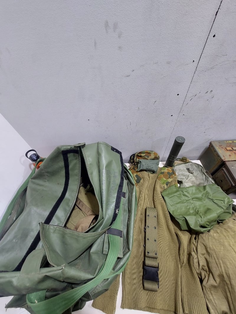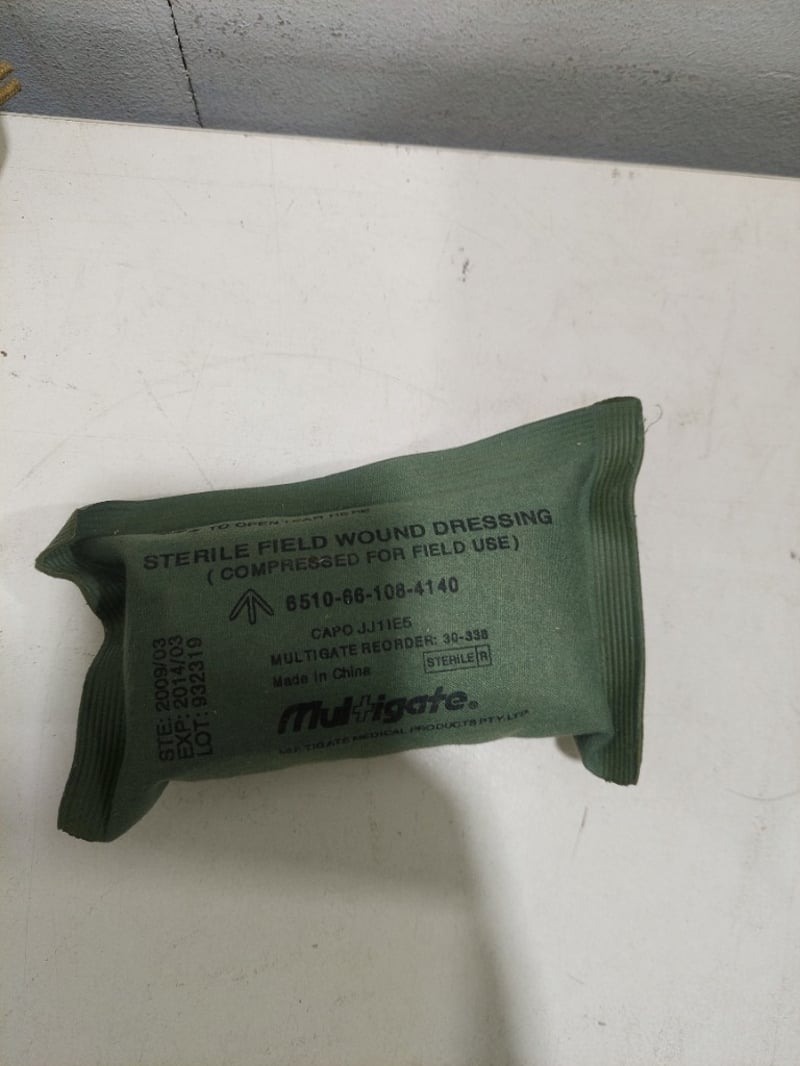 Assorted military items, including olive-green duffle bag, illumination flare, Multigate Sterile Field Wound Dressing, clothing and more.Sold as a lot.