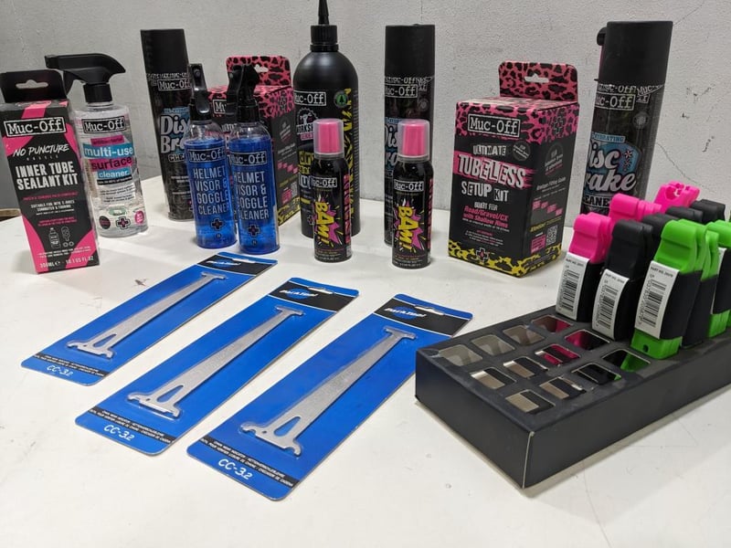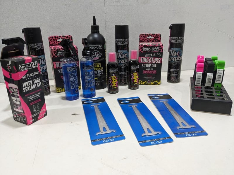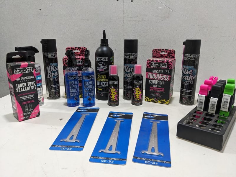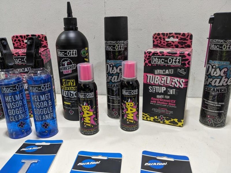 Assorted bicycle items includes, helmet visor and goggle cleaner, disc brake cleaner and more...Sold as a lot.
