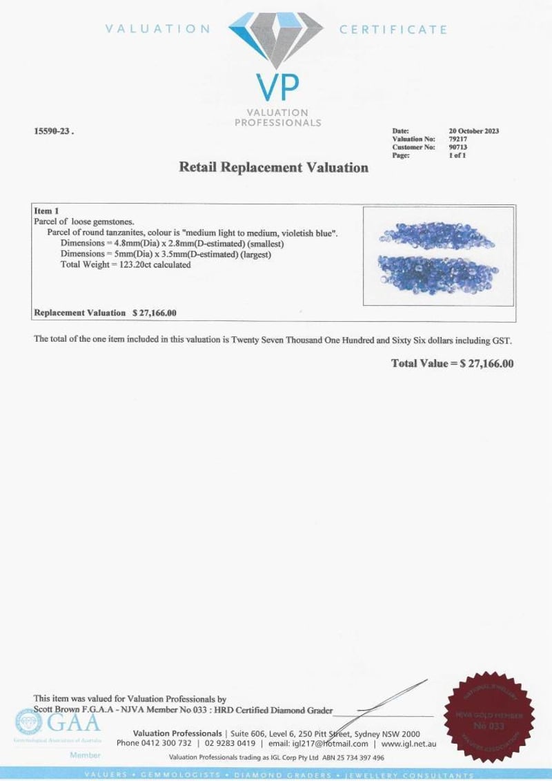 PARCEL OF ROUND TANZANITES Parcel Of Loose Gemstones. Parcel Of Round Tanzanites, Colour Is "Medium Light To Medium, Violetish Blue". Dimensions= 4.8Mm(Dia) X 2.8Mm(D-Estimated) (Smallest) Dimensions= Smm(Dia) X 3.Smm(D-Estimated) (Largest) Total Weight= 123.20Ct Calculated Valuations Provided by an Independent Third-Party Professional Not Directly Associated With Lloyds Auctions at AUD $27166This valuation has been conducted by an independent third-party professional. The valuation amount is an assessment by the issuing valuer and does not reflect the auction value of the item. Any inquiries regarding the valuation should be directed to the issuing valuer (refer to contact details on the certificate), as Lloyds Auctions has no affiliation or influence over the valuation, the valuer, or the stated amount. Condition: Good - Refer Images 0488968+23