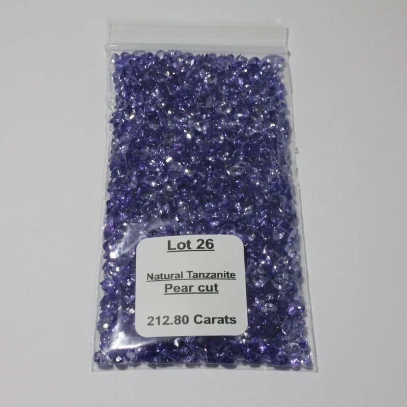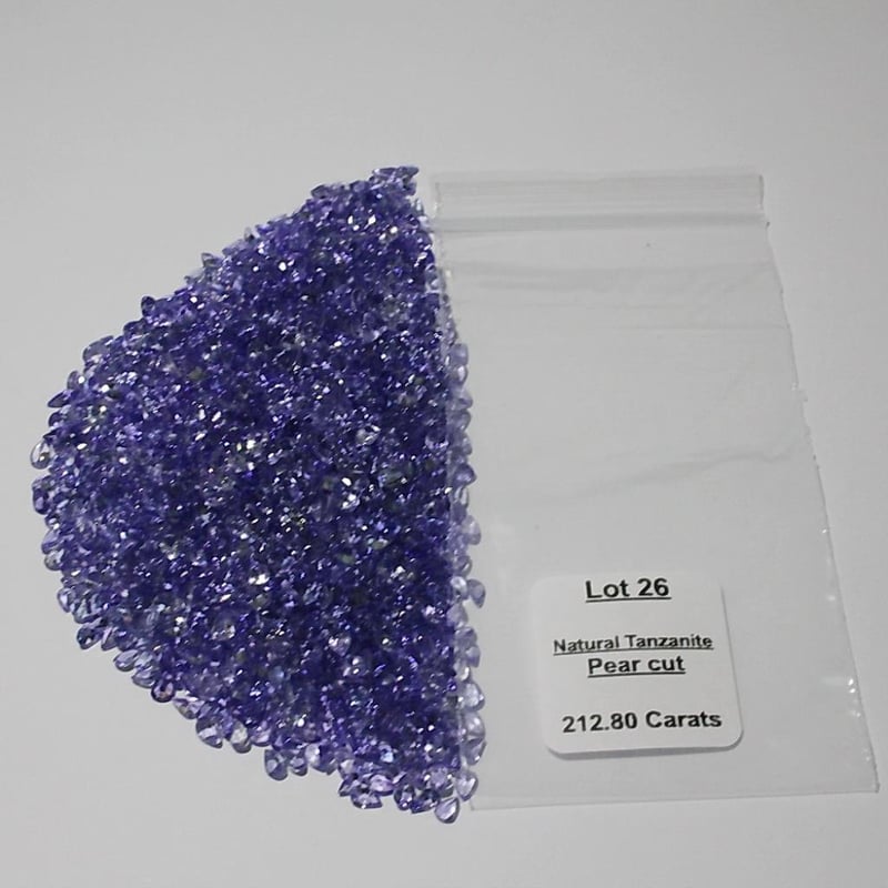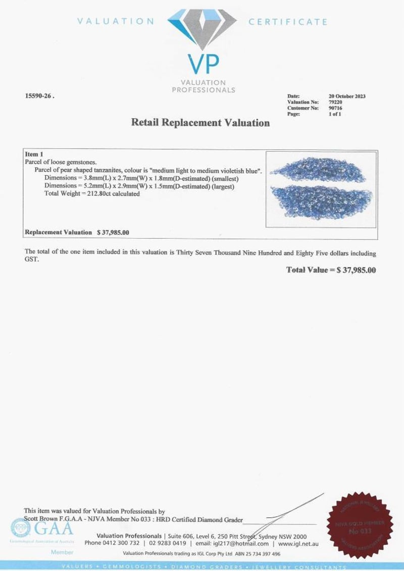 PARCEL OF PEAR SHAPED TANZANITES Parcel Of Loose Gemstones. Parcel Of Pear Shaped Tanzanites, Colour Is "Medium Light To Medium Violetish Blue". Dimensions= 3.8Mm(L) X 2.7Mm(W) X L.8Mm(D-Estimated) (Smallest) Dimensions= 5.2Mm(L) X 2.9Mm{W) X 1.5Mm(D-Estimated) (Largest) Total Weight= 212.80Ct Calculated Valuations Provided by an Independent Third-Party Professional Not Directly Associated With Lloyds Auctions at AUD $37985This valuation has been conducted by an independent third-party professional. The valuation amount is an assessment by the issuing valuer and does not reflect the auction value of the item. Any inquiries regarding the valuation should be directed to the issuing valuer (refer to contact details on the certificate), as Lloyds Auctions has no affiliation or influence over the valuation, the valuer, or the stated amount. Condition: Good - Refer Images 0488968+26