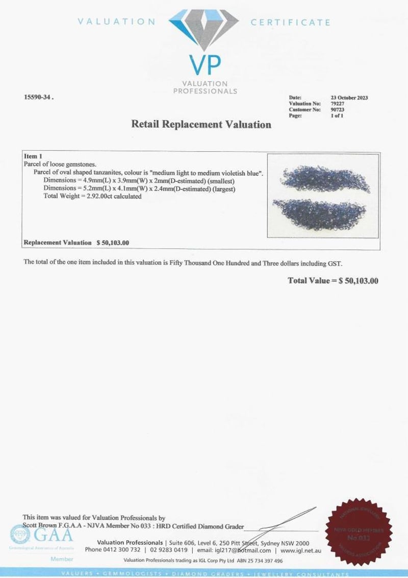 PARCEL OF OVAL SHAPED TANZANITES Parcel Ofloose Gemstones. Parcel Of Oval Shaped Tanzanites, Colour Is "Medium Light To Medium Violetish Blue". Dimensions= 4.9Mm(L) X 3.9Mm(W) X 2Mm(D-Estimated) (Smallest) Dimensions= 5.2Mm(L) X 4.Lmm(W) X 2.4Mm(D-Estimated) (Largest) Total Weight= 292.00Ct Calculated Valuations Provided by an Independent Third-Party Professional Not Directly Associated With Lloyds Auctions at AUD $50103 This valuation has been conducted by an independent third-party professional. The valuation amount is an assessment by the issuing valuer and does not reflect the auction value of the item. Any inquiries regarding the valuation should be directed to the issuing valuer (refer to contact details on the certificate), as Lloyds Auctions has no affiliation or influence over the valuation, the valuer, or the stated amount. Condition: Good - Refer Images 0 488968+34