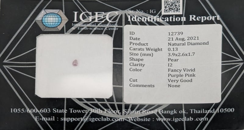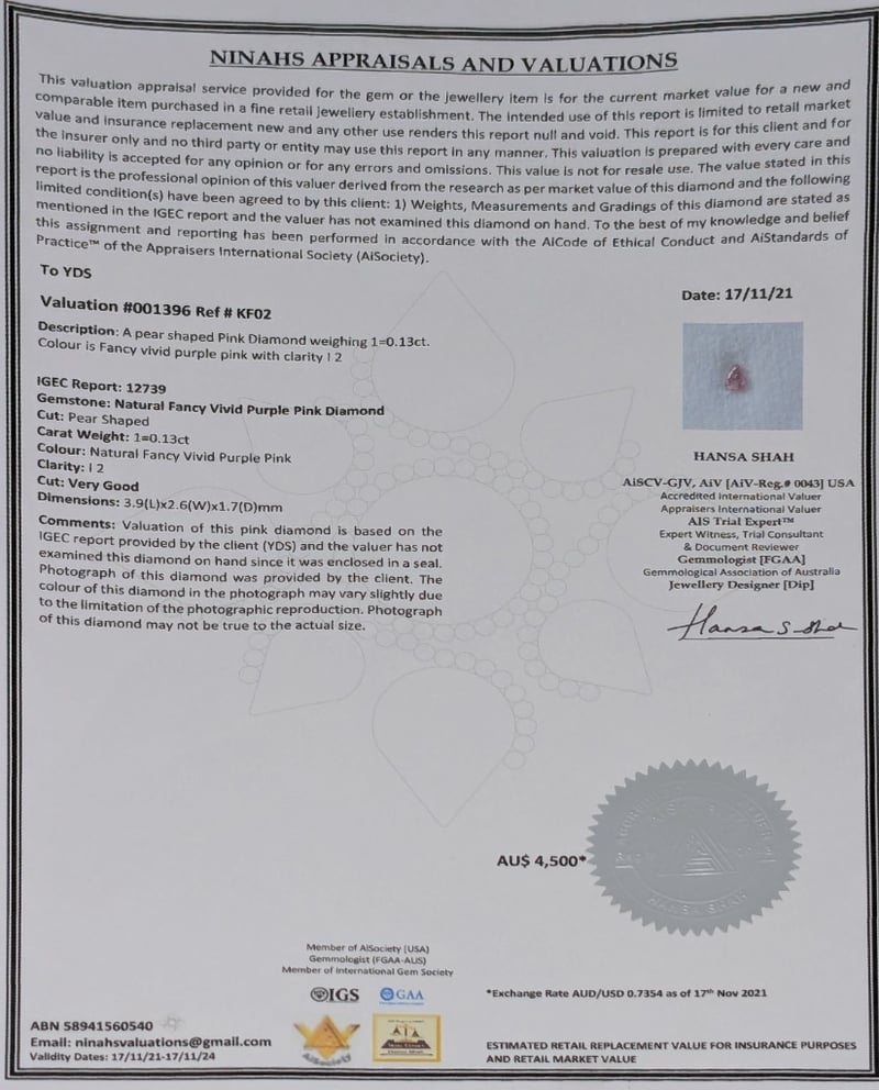 0.13 PEAR CUT PURPLE PINK NATURAL DIAMOND I2, Fancy Vivid Purple Pink Accompanied By Ninahs Valuations Report #001396 Ref#Kf02 And Igec Indentification Report Dimensions: Height: 3.90mm, Width: 2.60mm, Depth: 1.70mm Condition: Good - Refer To Images This valuation has been conducted by an independent third-party professional. The valuation amount is an assessment by the issuing valuer and does not reflect the auction value of the item. Any inquiries regarding the valuation should be directed to the issuing valuer (refer to contact details on the certificate), as Lloyds Auctions has no affiliation or influence over the valuation, the valuer, or the stated amount. Insurance Replacement Valuation Amount: $4,500.00 FC 162968+5