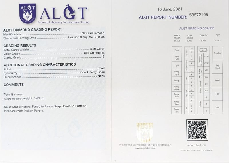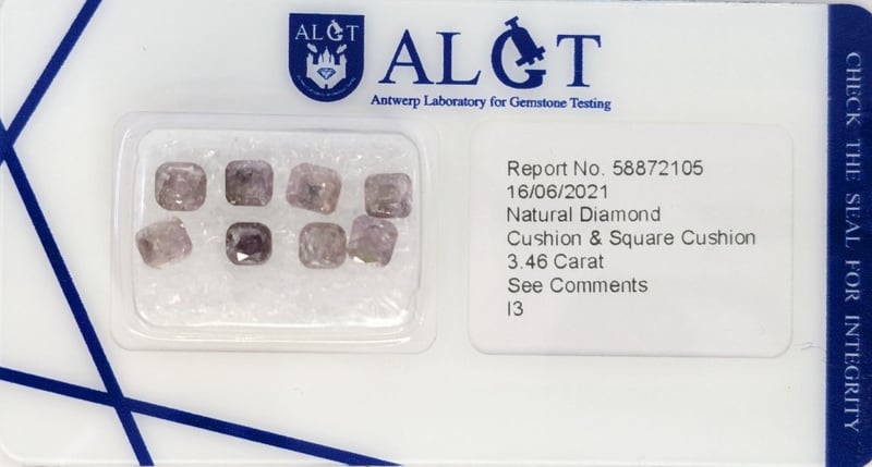 3.46TCW CUSHION PINKISH PURPLE NATURAL DIAMONDS 8 Stones, 0.43 Ct I3 Cushion & Square Chusion Pinkish Purple Accompanied By Algt Report No. 58872105 Condition: Good - Refer To Images FC 162968+12