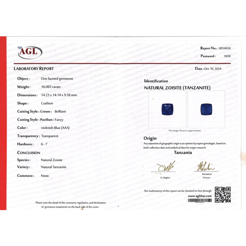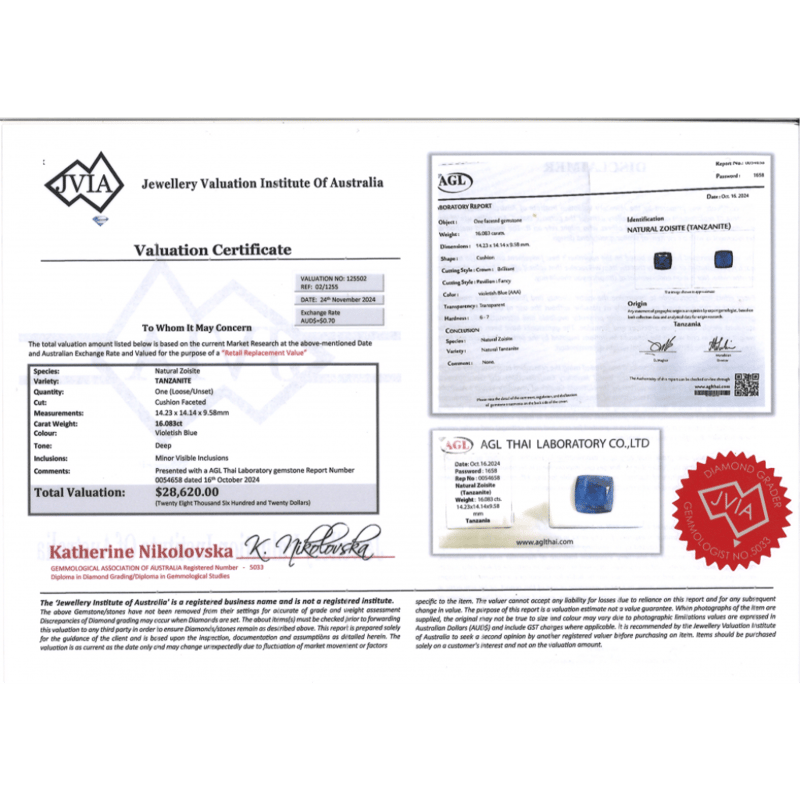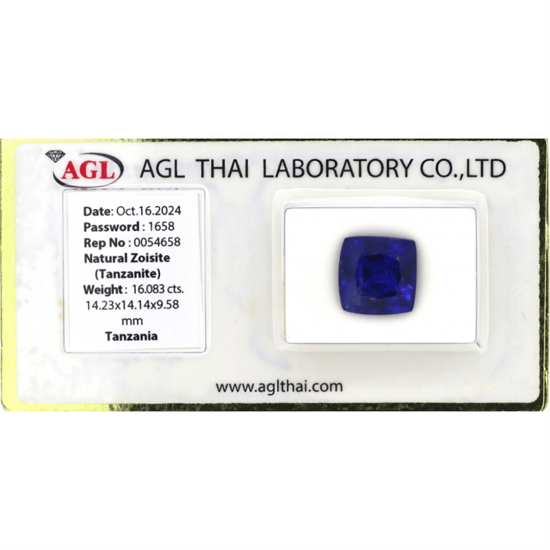 16.083CT CERTIFIED, NATURAL TANZANITE, CUSHION BRILLIANT CUT, VIOLETISH-BLUE, LOOSE, UNSET. STONE COMES SEALED WITH AGL REPORT: 0054658. Valuations Provided by an Independent Third-Party Professional Not Directly Associated With Lloyds Auctions at AUD $28620This valuation has been conducted by an independent third-party professional. The valuation amount is an assessment by the issuing valuer and does not reflect the auction value of the item. Any inquiries regarding the valuation should be directed to the issuing valuer (refer to contact details on the certificate), as Lloyds Auctions has no affiliation or influence over the valuation, the valuer, or the stated amount. Condition: Good - Refer Images 0+2396