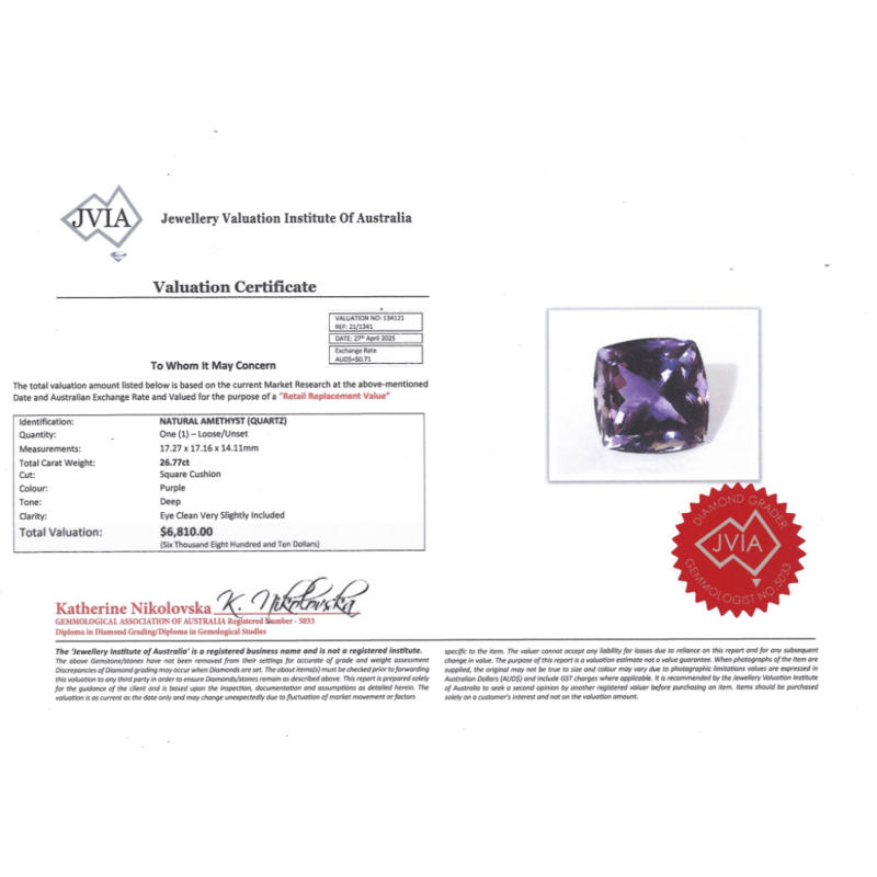 26.77CT NATURAL AMETHYST, SQUARE CUSHION CUT, DEEP PURPLE, EYE CLEAN-VERY SLIGHTLY INCLUDED, LOOSE, UNSET. Valuations Provided by an Independent Third-Party Professional Not Directly Associated With Lloyds Auctions at AUD $6810This valuation has been conducted by an independent third-party professional. The valuation amount is an assessment by the issuing valuer and does not reflect the auction value of the item. Any inquiries regarding the valuation should be directed to the issuing valuer (refer to contact details on the certificate), as Lloyds Auctions has no affiliation or influence over the valuation, the valuer, or the stated amount. Condition: Good - Refer Images 0+2395