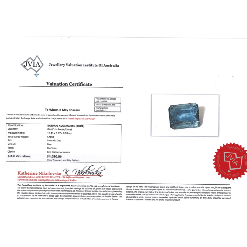 5.98CT, NATURAL BERYL AQUAMARINE, EMERALD CUT, MEDIUM BLUE, INCLUDED, LOOSE, UNSET. Valuations Provided by an Independent Third-Party Professional Not Directly Associated With Lloyds Auctions at AUD $4050This valuation has been conducted by an independent third-party professional. The valuation amount is an assessment by the issuing valuer and does not reflect the auction value of the item. Any inquiries regarding the valuation should be directed to the issuing valuer (refer to contact details on the certificate), as Lloyds Auctions has no affiliation or influence over the valuation, the valuer, or the stated amount. Condition: Good - Refer Images 0+2343