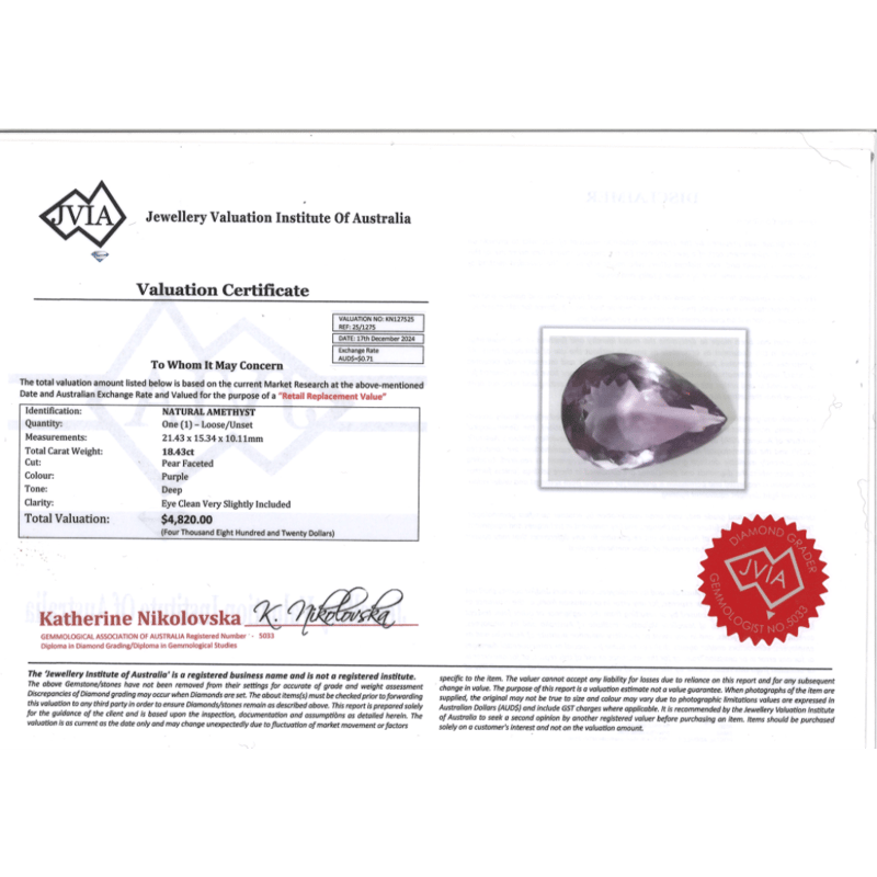 18.43CT NATURAL AMETHYST, PEAR FACETED CUT, DEEP MODERATE PURPLE, EYE CLEAN - SLIGHTLY INCLUDED, LOOSE, UNSET. Valuations Provided by an Independent Third-Party Professional Not Directly Associated With Lloyds Auctions at AUD $4820This valuation has been conducted by an independent third-party professional. The valuation amount is an assessment by the issuing valuer and does not reflect the auction value of the item. Any inquiries regarding the valuation should be directed to the issuing valuer (refer to contact details on the certificate), as Lloyds Auctions has no affiliation or influence over the valuation, the valuer, or the stated amount. Condition: Good - Refer Images 0+2308